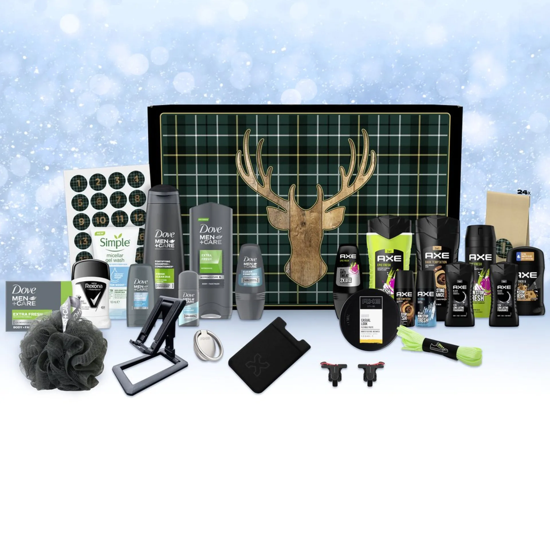 De Geschenkset Bestaat Uit Twee Axe Black 3-In-1 Mini Douchegels, Een Axe Dark Temptation 3-In-1 Douchegel En Een Axe Epic Fresh 3-In-1 Douchegel. Eenmaal Uit De Douche, Heeft Hij Drie Deodorants Om Uit Te Kiezen. De Axe Ice Chill, Dark Temptation En Epic Fresh Bodyspray Deodorant. Er Is Een Axe Leather & Cookie Deodorant Stick En Een Axe Epic Fresh Anti-Transpirant Roller. Om Zijn Kapsel Af Te Maken, Zit Er Een Axe Styling Definition Paste In Deze Geschenkset. Ook Dove Men+Care Is Goed Vertegenwoordigd Met Een Dove Men+Care Fresh Clean 2-In-1 Shampoo, Dove Men+Care Extra Fresh Douchegel, Dove Men+Care Clean Comfort Douchegel, Dove Men+Care Extra Fresh Body + Face Bar, Dove Men+Care Clean Comfort Anti-Transpirant Spray En Een Dove Men+Care Clean Comfort Anti-Transpirant Roller, Een Rexona Invisible On Black + White Anti-Transpirant Stick En, Om Zijn Huid Zacht Maar Effectief Te Reinigen, Een Simple Micellar Gel Wash. Om Deze Doe-Het-Zelf Adventskalender Met 24 Papieren Zakjes En 24 Stickers In Een Feestelijke Doos Compleet Te Maken, Hebben We Zes Mannelijke Verrassingsaccessoires Meegeleverd: Telefoontriggers, Een Douchepuff, Kaarthouder, Telefoonstandaard, Glow-In-The-Dark Schoenveters En Een Telefoonringhouder.