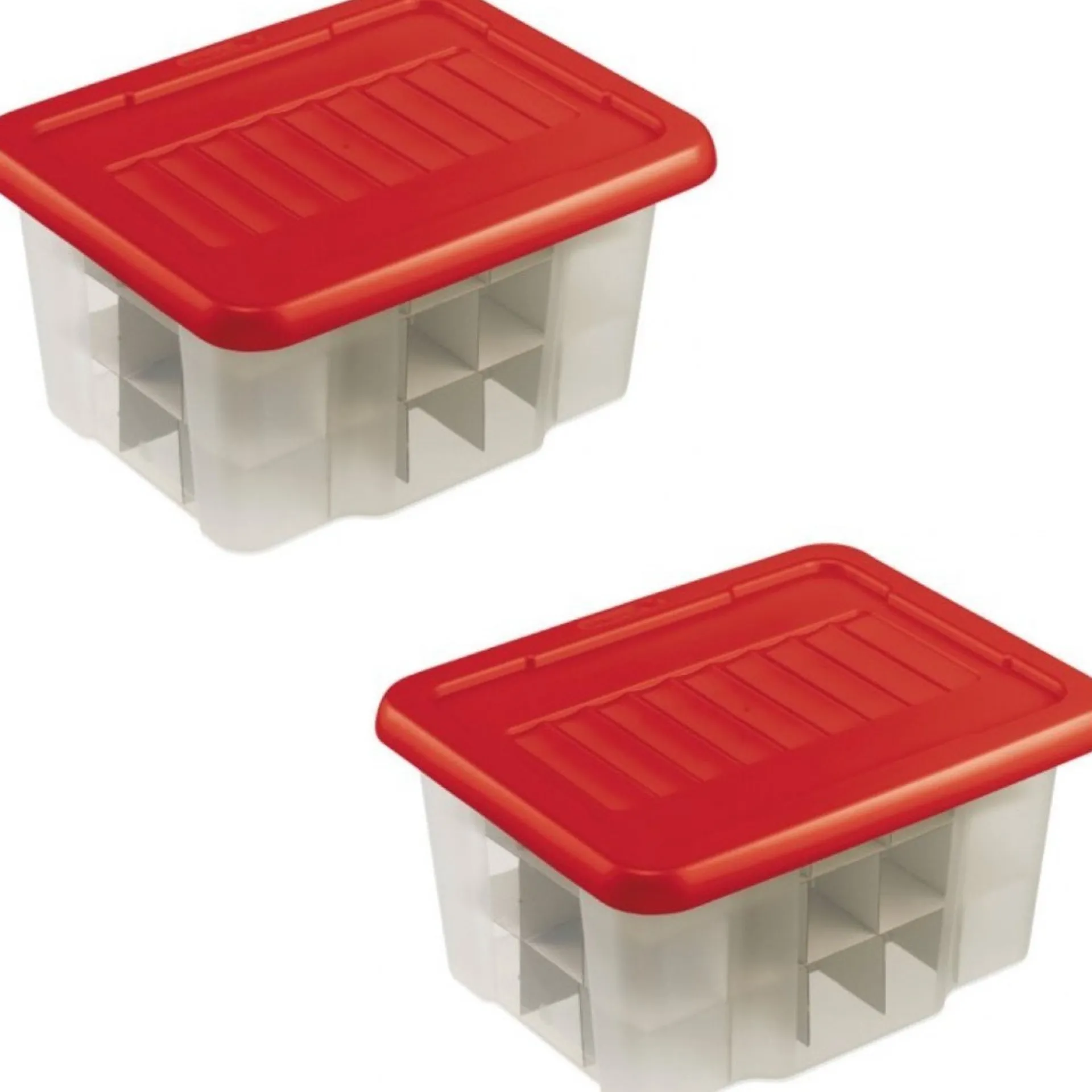 2X Kerstballen/Kerstversiering Opruimen Opbergboxen Voor 45 Kerstballen 24 Liter. Kunststof Opbergboxen Voor Het Vocht- En Stofvrij Opbergen Van Kerstballen. Deze Box Wordt Geleverd Inclusief Speciale Kartonnen Trays Waarin 45 Kerstballen Per Box Opgeborgen Kunnen Worden. De Trays Zijn Makkelijk In Elkaar Te Zetten En Perfect Te Stapelen In De Box. De Deksel Van De Box Is Rood. Buiten Formaat: 43 X 34,5 X 22,5 Cm. Materiaal: Kunststof. U Ontvangt 2 Boxen. Kerstversiering/Kerstdecoratie En Kerstballen Opbergen/Opruimen.