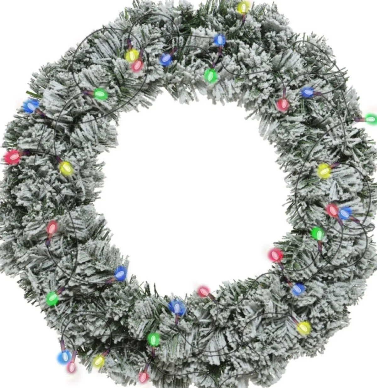 Kerstkrans/Dennenkrans Groen Met Sneeuw 35 Cm Incl. Verlichting Gekleurd. Kerstkrans/Dennenkrans Inclusief Verlichting Gekleurd. Aantal Lampjes: 48. Lengte Lichtsnoer: 4 Meter. Formaat Krans: D35Cm.