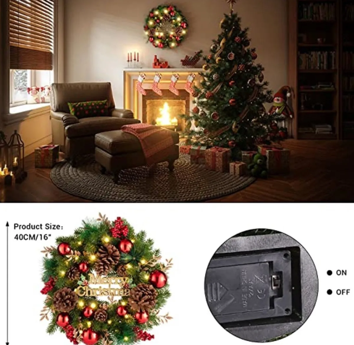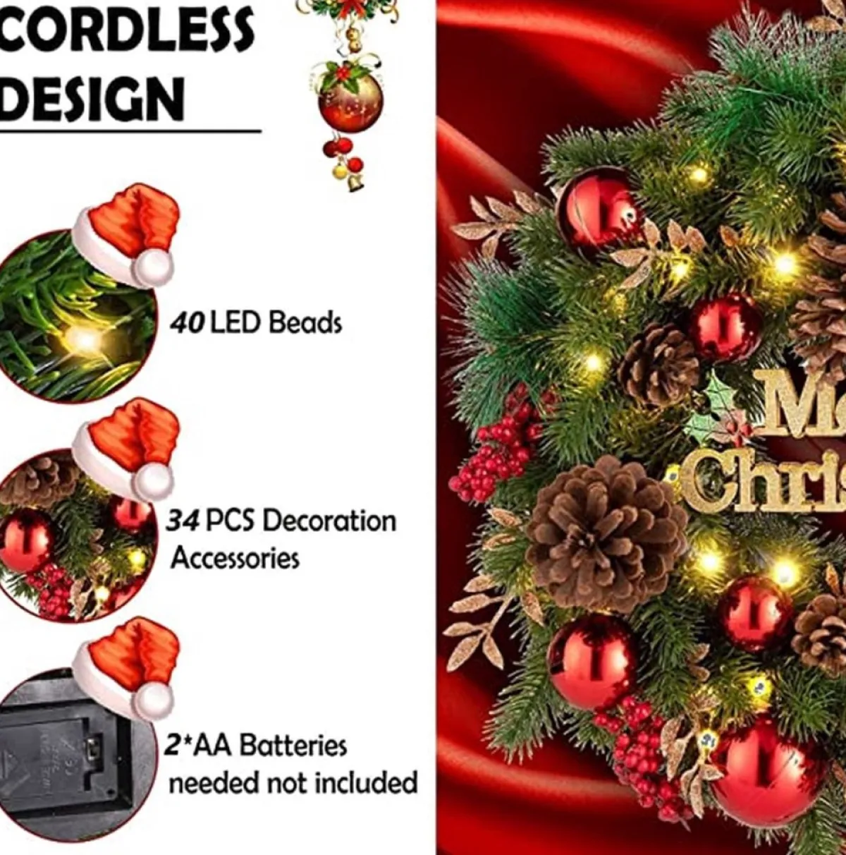 - Avoalre 40Leds Door Wreath Meets Ce And Fcc Certification. Low And Stable Voltage, Ensures High Safety, Saves Electricity And Is More Environmentally Friendly. Unlike Most Christmas Wreaths With Plugs, Our Christmas Wreath Is Battery-Powered And Uses 2 Aa Batteries (Not Included). Much Safer To Use And Use Anywhere, Never Limited By The Plug Position And More Energy Efficient.