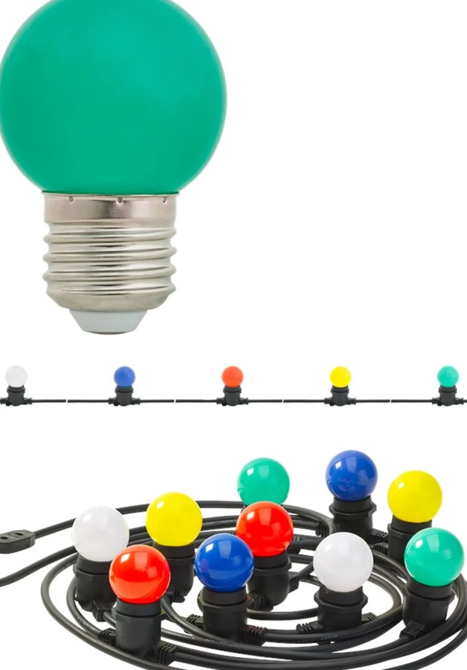 De 230V Led Partylights Is Een Kwaliteitsproduct Die U Het Gehele Jaar Buiten Kunt Laten Hangen. De Verlichtingssnoer Is Voorzien Van 10X E27 Fitting Met Vervangbare Led Lampen. Deze Uitvoering Heeft Een Totale Lengte Van 6,5M, Heeft 10X Gekleurde Led Lamp (Rood/Groen/Geel/Wit/Blauw) En Verbruikt Totaal Maar 10W.