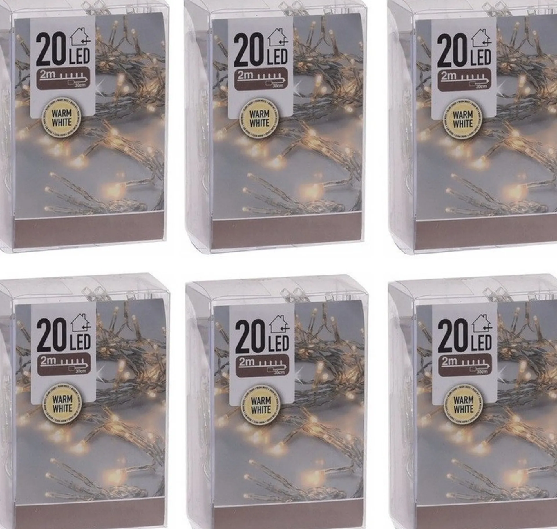 8X Kerstverlichting Op Batterij Warm Wit 20 Lampjes. Kerst Led Lichtsnoer Van 2 Meter Lang Met 20 Lampjes En Een 30 Cm Lang Aanloopsnoer Per Snoer. U Ontvangt 8 Snoeren. Het Snoer Is In Totaal 230 Cm Lang. Er Zit Ca. 10 Cm Ruimte Tussen Ieder Lampje. Exclusief 3X Aa Batterijen Per Snoer (3 V). De Verlichting Is Geschikt Voor Gebruik Binnenshuis.