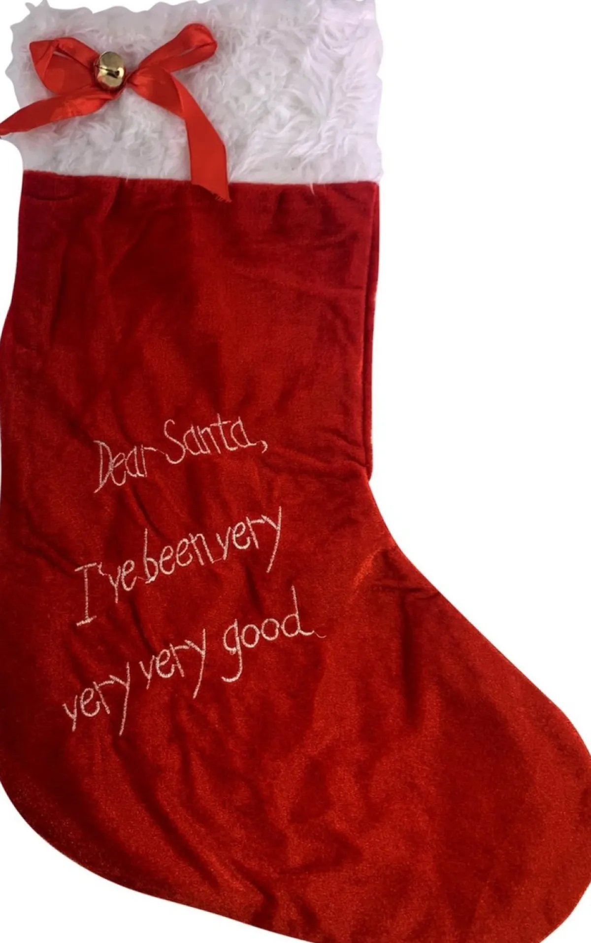 Deze Rode Kerstsok Siert Elke Huiskamer. Voor Het Raam, De Schouw Of Bij De Voordeur. De Rode Kerstsok Met Witte Rand En Een Borduursel Met Tekst ‘Dear Santa I Have Been Very Very Very Good’ Is 48 Centimeter Groot En Voelt Acht Aan Door De Fluwelen Stof. De Twee Kerstbelletjes (Ze Ringelen Ook Nog!) Maken De Kerstsfeer Compleet, Vrolijke Kerstfeest!