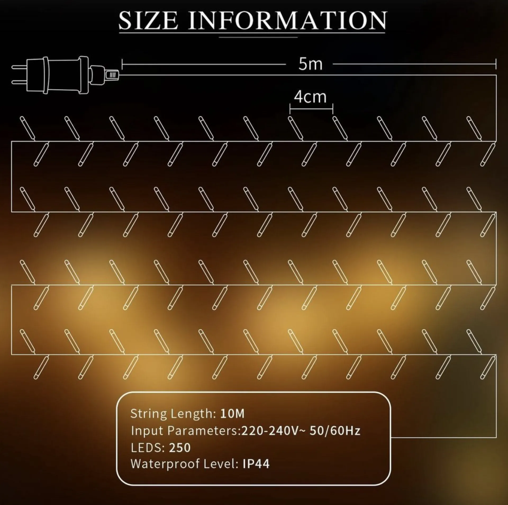 Kerstversiering Het Deel Met De 250 Leds Zelf Is 5 Meter Lang, En De Afstand Tussen De Stekker En Het Eerste Led Lampje Dus Ook 5 Meter; Je Kan Dus Een Flinke Oppervlakte Voorzien Van Deze Mooie Sfeerverlichting. De Led String Light Heeft Een Beschermingsgraad Van Ip44 (Spatwaterdicht) En Is Dus Geschikt Voor Buitengebruik.