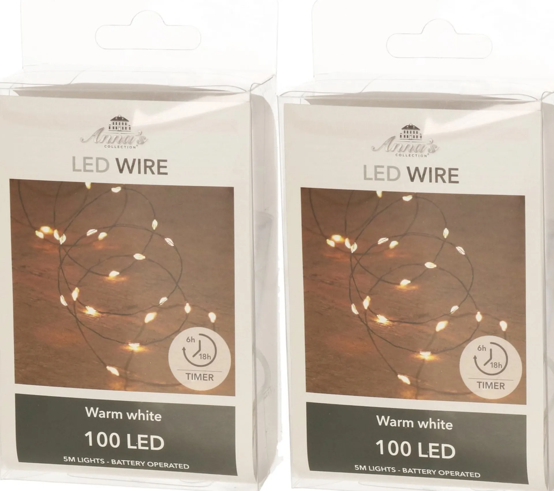 Set Van 2X Stuks Draadverlichting Lichtsnoer Met 100 Lampjes Warm Wit Op Batterij 500 Cm. Kleur Draad: Zwart.Lengte Lichtsnoer: 500 Cm.Lengte Aanloopsnoer: 10 Cm.Aantal Lampjes: 100 Leds.Kleur Licht: Warm Wit.Timer: Inclusief 6/18 Uurs Timer.Voeding: 3X Aa Batterijen Per Lichtsnoer (Niet Inbegrepen). Ip-Klasse: Ip20.Geschikt: Binnen. Kerstverlichting/Sfeerverlichting Draad Met Led Lampjes Verlichting.