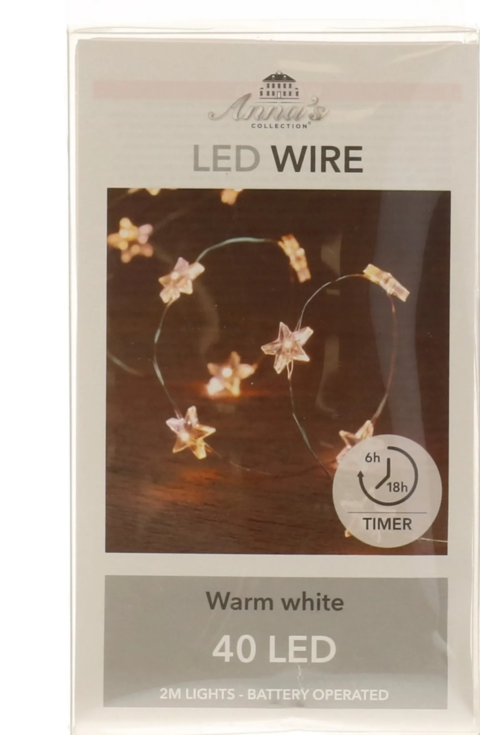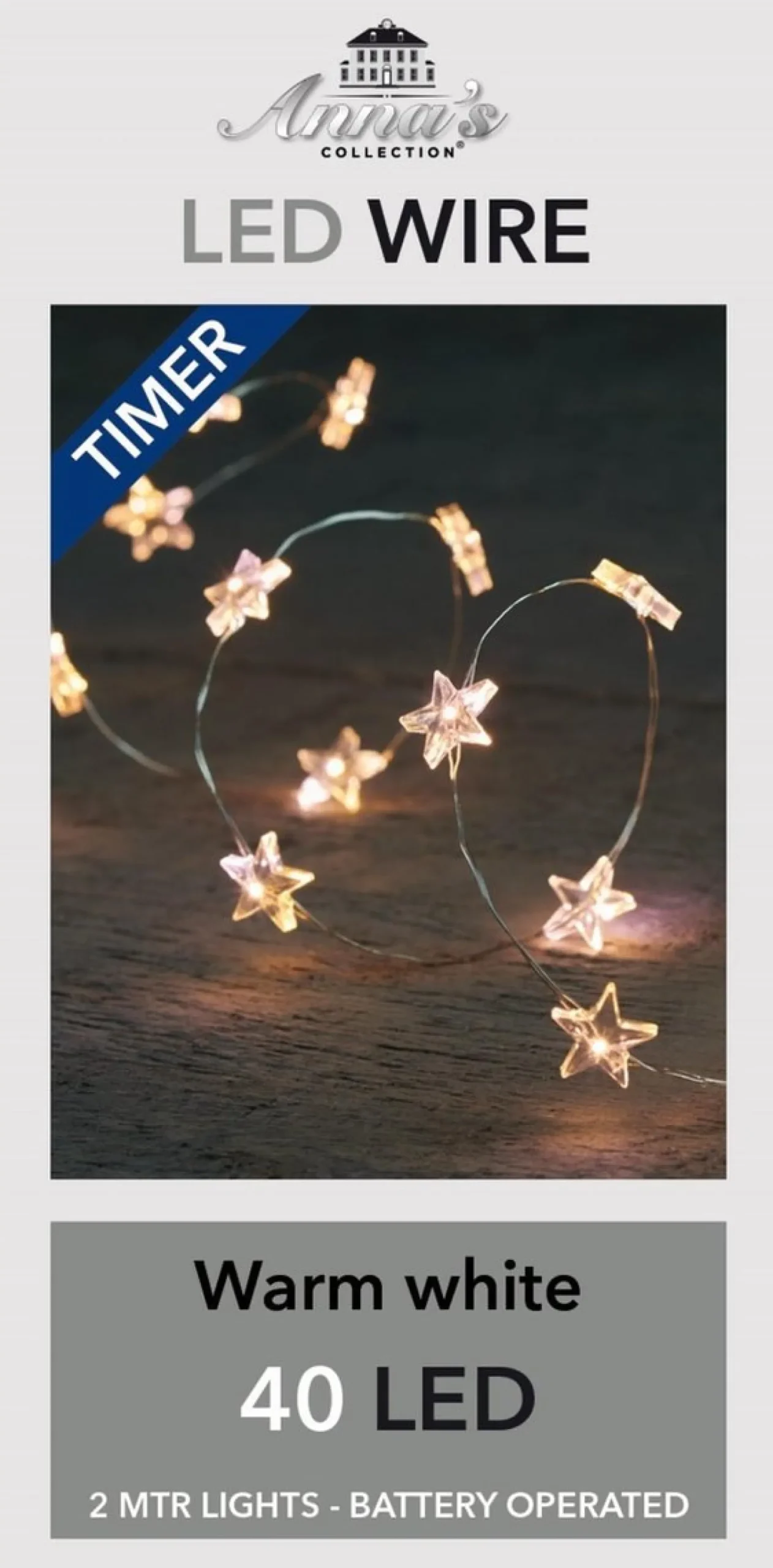 Zilveren Draadverlichting Sterren Met Timer Warm Wit 2 Meter. Zilverkleurige Lichtdraad Met 40 Warm Witte Sterrenlampjes Verdeeld Over 1 Draad Van 200 Cm. De Lichtsnoer Heeft Een 6/18 Uur Timer Met Aan/Uit Functie En Werkt Op 2 Aa Batterijen (Niet Inbegrepen).Lengte: 2 Meter.Kleur: Warm Wit.Voor Binnen Gebruik. Sfeerverlichting/Draadverlichting Met Sterren Lampjes Die Warm Licht Geven.