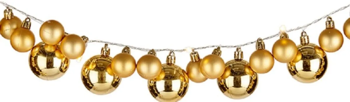 Verlichte Kerst Guirlande/Slinger Met 93 Led Kerstballen Goud. Deze Slinger Heeft 93 Kunststof Kerstballen In De Kleur Goud. Afmeting 180 Cm. Materiaal: Kunststof. Exclusief 2X Aa Batterijen. Kerstversiering/Kerstdecoratie Slingers/Kerstslingers.