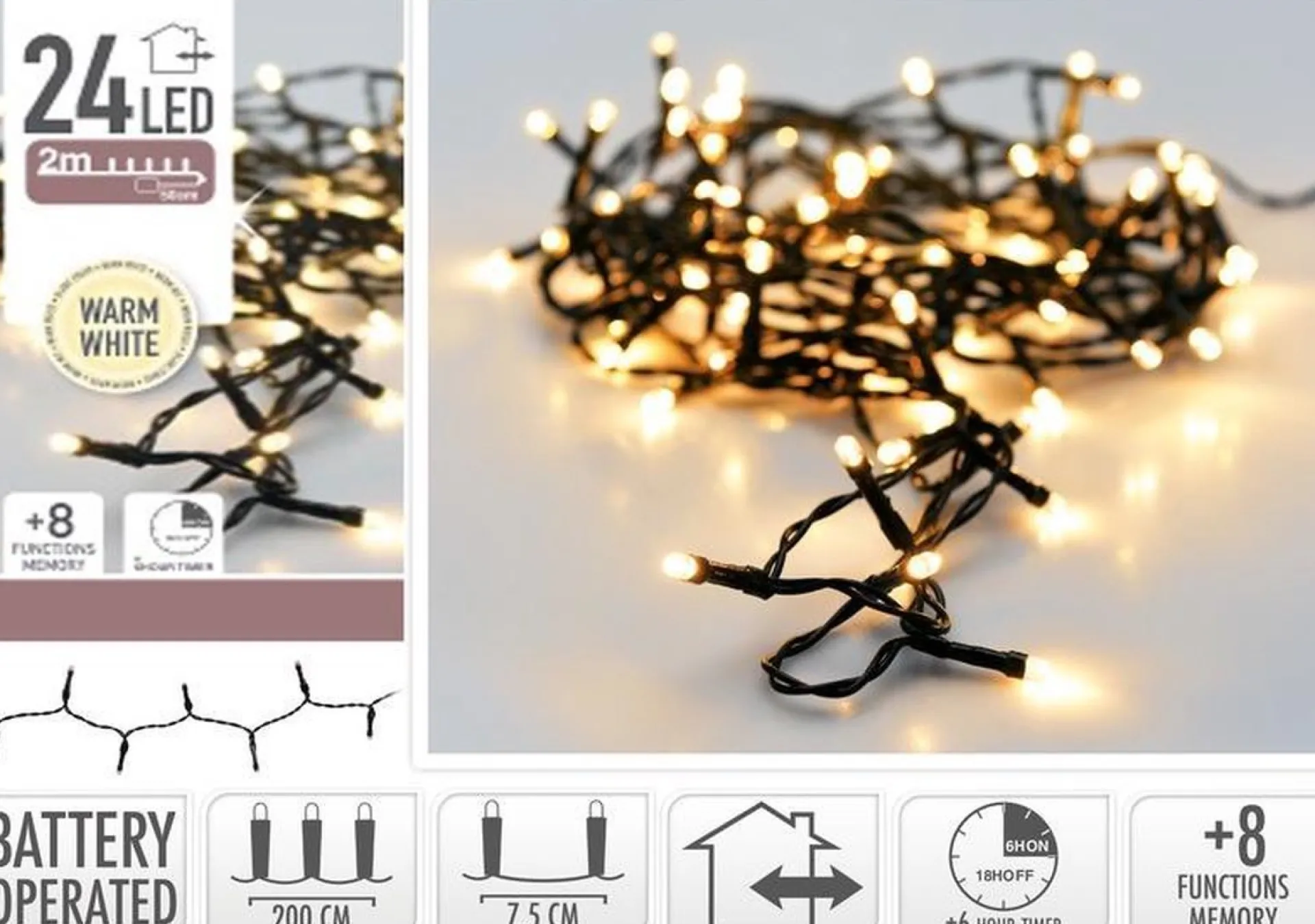 Kerstverlichting 24 Warm Witte Lampjes Op Batterij 2 Meter Met Timer. Kerst Led Lichtsnoer Van 2 Meter Lang Met 24 Lampjes En Een 50 Cm Lang Aanloopsnoer. Er Zit Ca. 7,5 Cm Ruimte Tussen Ieder Lampje. Exclusief 3X Aa Batterijen (3 V). De Verlichting Is Geschikt Voor Gebruik Binnen- En Buitenshuis. De Verlichting Kan Op 8 Verschillende Standen Gezet Worden, En Heeft Een Uit/Aan Timer. Kleur Snoer: Zwart. Kleur Licht: Warm Wit. Formaat Lampje: 0,5 Cm. Kerstverlichting Lichtsnoeren/Vaasverlichting Op Batterijen.