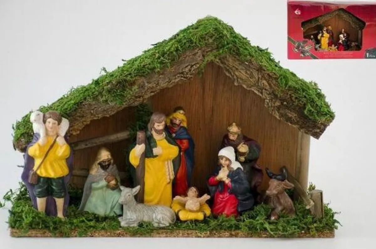 Kerststal Hout Met 9 Figuren (2155)Maat 35Cm Breed 22Cm HoogFiguren Zitten Vast.