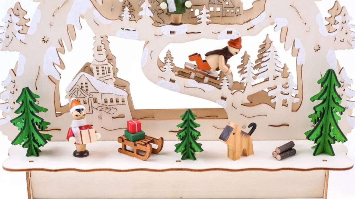 Het Is De Driedelige Look Die Deze Lichtboog Zo Bijzonder: De Bovenkant Is Het Decor Van Enkele Dromerige Huizen En Linksonder Een Kerk. De Niveaus Zijn Verbonden Door Paden Omzoomd Met Dennenbomen, Waarop Een Van De Liefdevol Met De Hand Geschilderde Figuren De Berg Af Sleet. Er Is Een Houten Slee Met Geschenken, Boomstammen, Een Ezel En Vele Andere Details. De Daken En Dennenbomen Zijn Versierd Met Kunstsneeuw. Het Hart Van Het Buitengewoon Mooie Stuk Is De Natuurlijke Houten Lijst, Waarvan Delen Zijn Gebeitst.