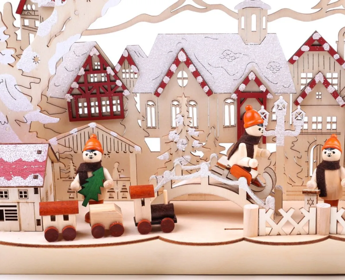 Het Is De Tweedelige Look Die De Lichtboog Zo Bijzonder Maakt. Op De Top Is De Achtergrond Van Een Dromerige Bosnederzetting. In Het Midden Van Het Landschap Staan Dennenbomen, Een Boswachtershut En Twee Hutten Voor Houtskoolbranders. Hier Kun Je De Houtsnijders Aan Het Werk Zien. De Daken Van De Huizen En De Dennenbomen Zijn Versierd Met Kunstsneeuw. Het Hart Van Het Prachtige Decor Is Het Natuurlijke Houten Frame, Waarvan Sommige Accenten Zijn Gebeitst En Liefdevol Met De Hand Beschilderd.