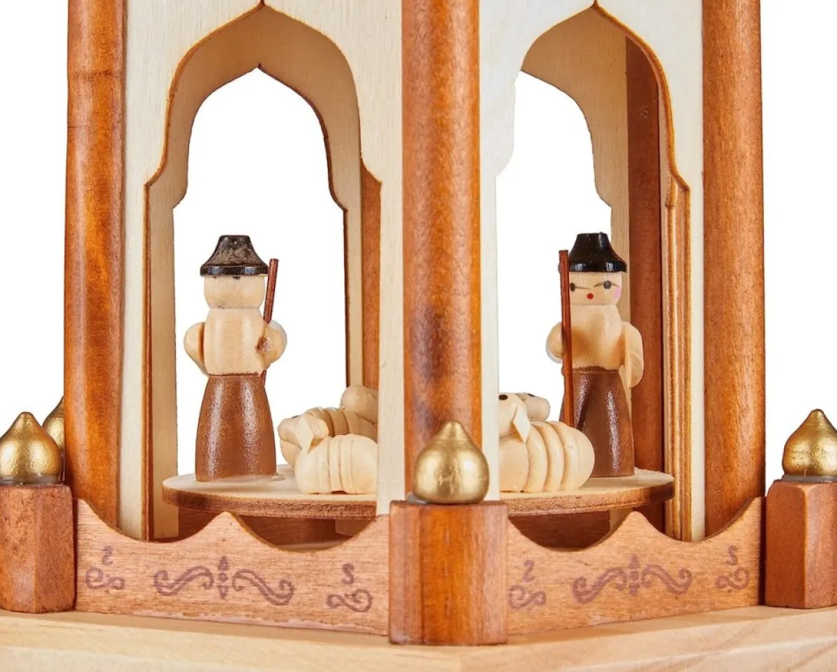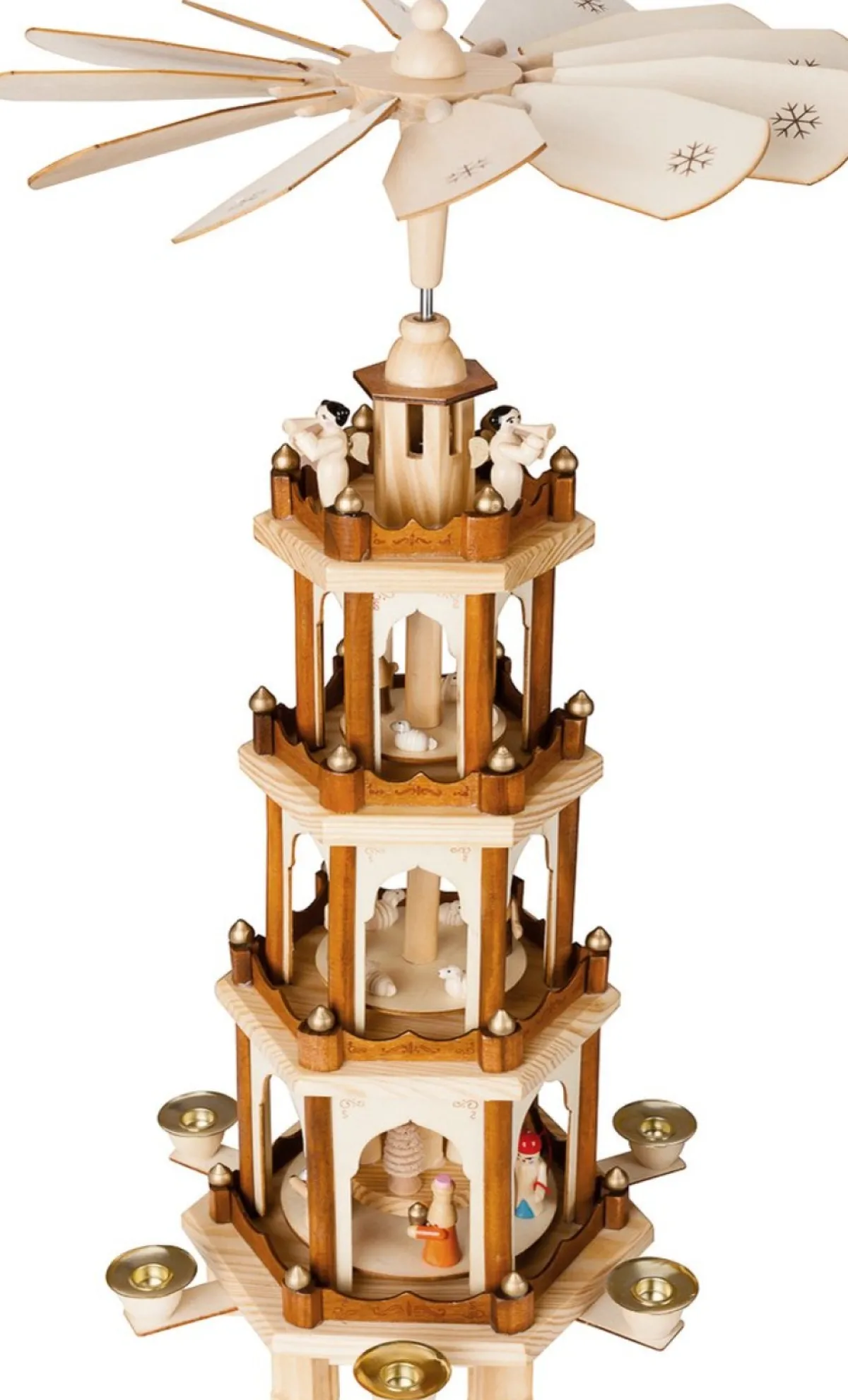 Klassiek VakmanschapEen Kunstig Gemaakt Hekwerk Omsluit Elk Individueel Niveau. Gouden Bollen In De Vorm Van Kegels Zijn Aan De Afrasteringspalen Bevestigd. De Niveaus Worden Ondersteund Door Zuilen, Liefdevol Gezaagde Moorse Bogen Doen Denken Aan Het Avondland. Zes Piramide Kaarsen Zijn Nodig Voor De Werking. De Zes Kandelaars Zijn Bevestigd Aan Het Onderste Platform.