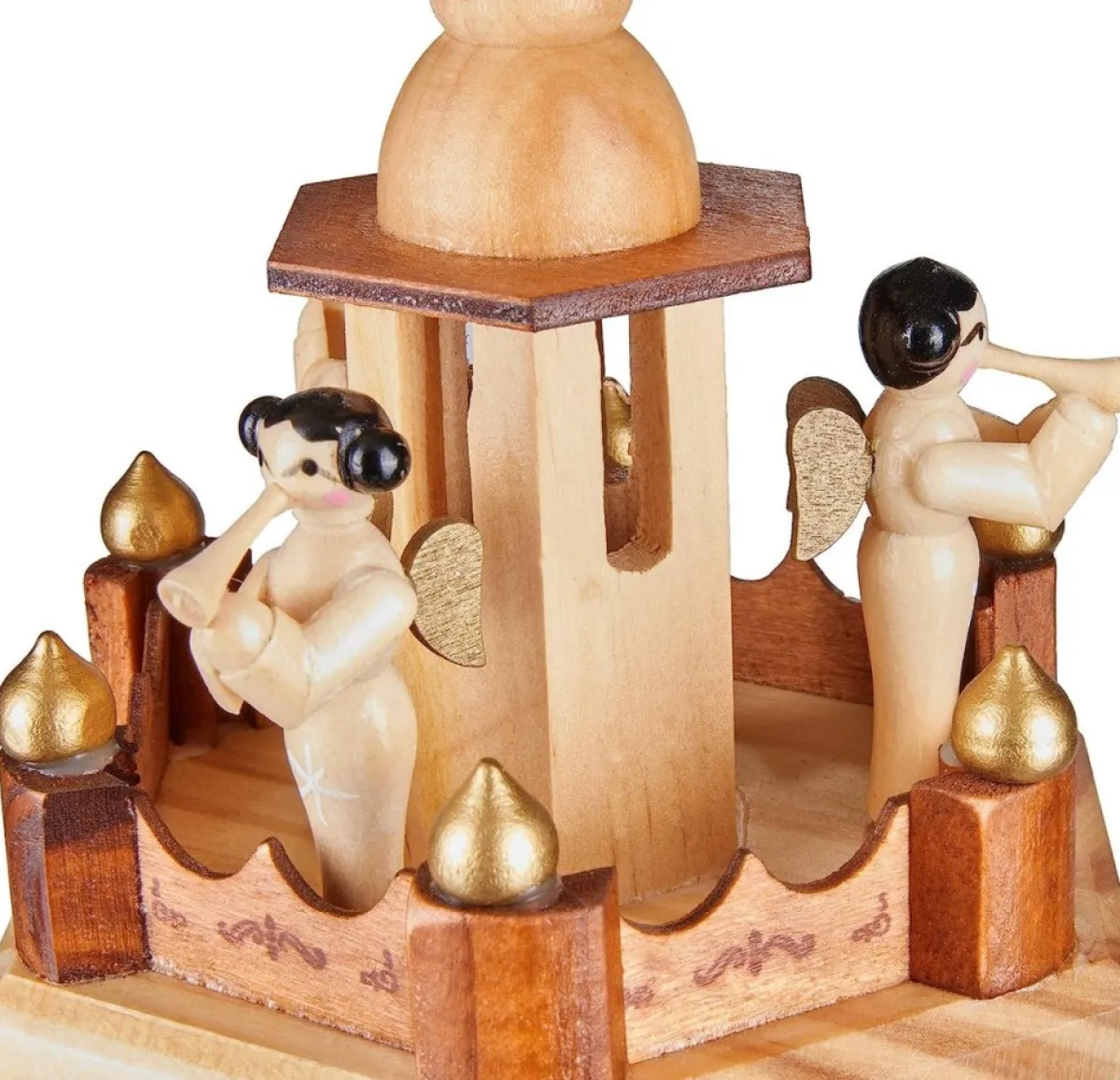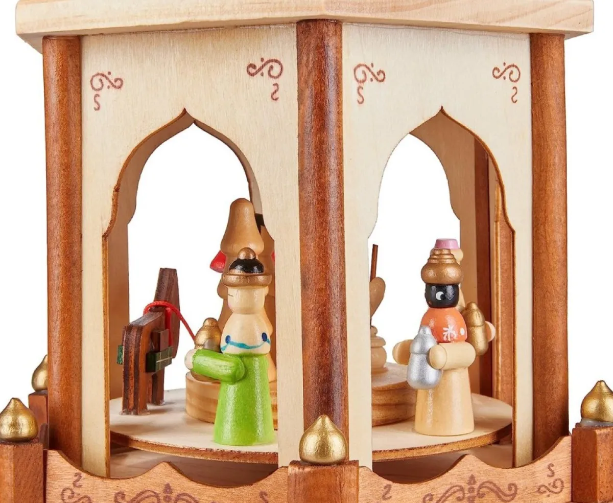 Handgeschilderde FigurenVerschillende Scenes Uit Het Bijbelse Kerstverhaal Komen Tot Leven Op De Individuele Niveaus. Op Het Bovenste Niveau, Dat Niet Kan Worden Gedraaid, Kondigen Engelen Met Trompetten De Geboorte Van Het Kindje Jezus Aan. Op Het Middelste Niveau Maken De Schapen Hun Rondjes. Op Het Onderste, Draaiende Niveau Is De Geboorte Van Christus Afgebeeld Met Maria En Jozef En De Komst Van De Wijzen. Elk Figuur Is Met De Hand Geschilderd.