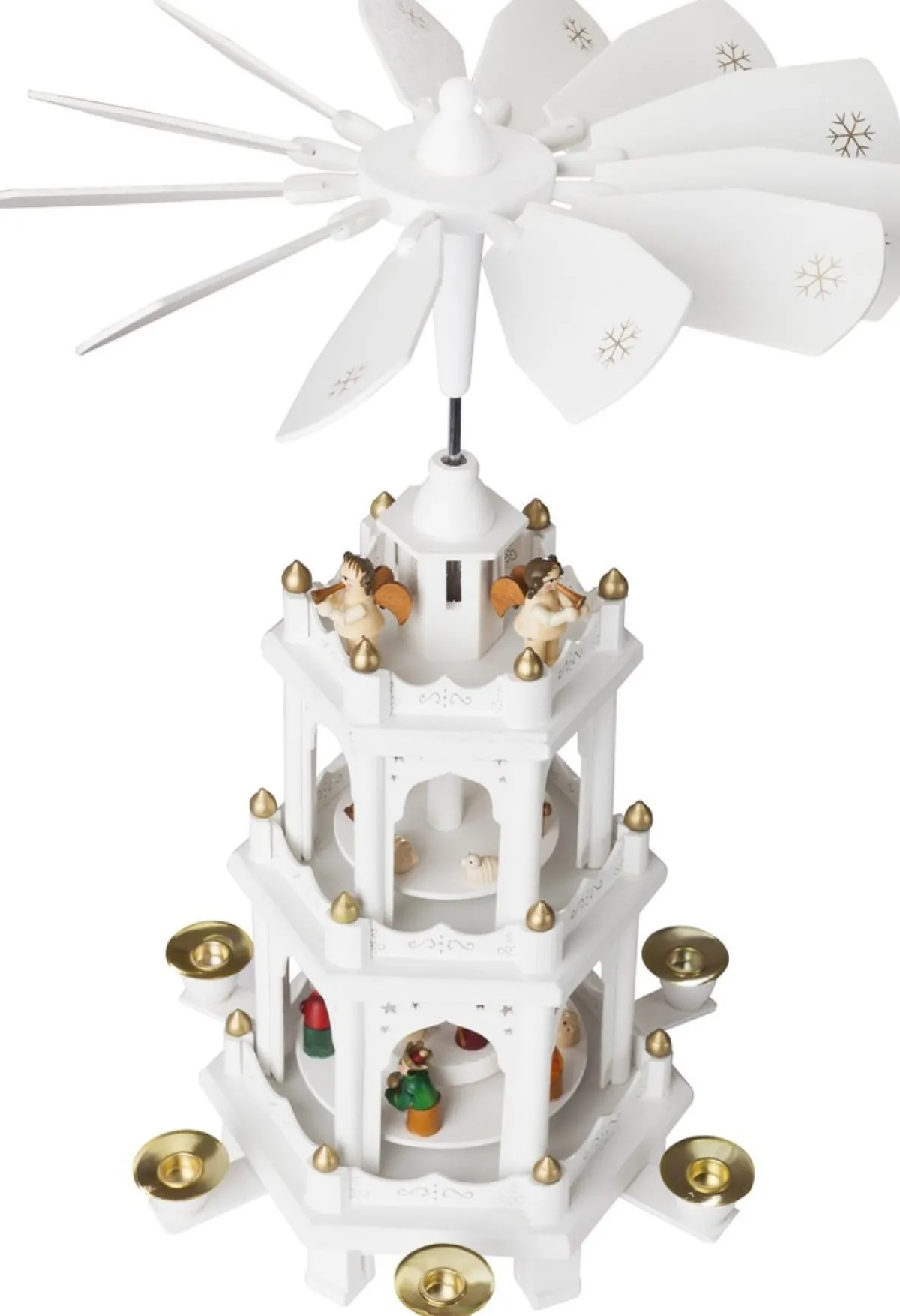 Handgeschilderde FigurenVerschillende Scenes Uit Het Bijbelse Kerstverhaal Komen Tot Leven Op De Individuele Niveaus. Op Het Bovenste Niveau, Dat Niet Kan Worden Gedraaid, Kondigen Engelen Met Trompetten De Geboorte Van Het Kindje Jezus Aan. Op Het Middelste Niveau Maken De Schapen Hun Rondjes. Op Het Onderste, Draaiende Niveau Is De Geboorte Van Christus Afgebeeld Met Maria En Jozef En De Komst Van De Wijzen. Elk Figuur Is Met De Hand Geschilderd.