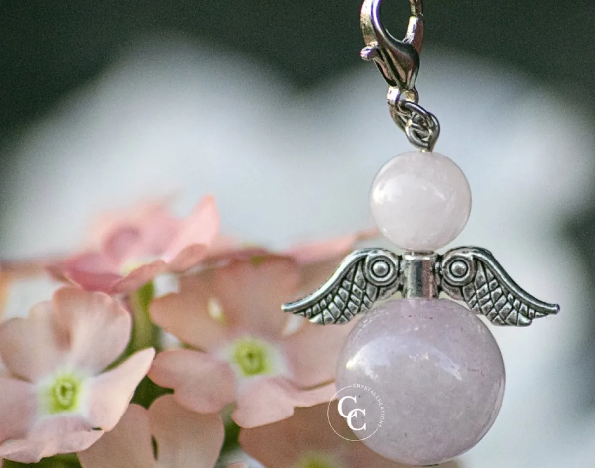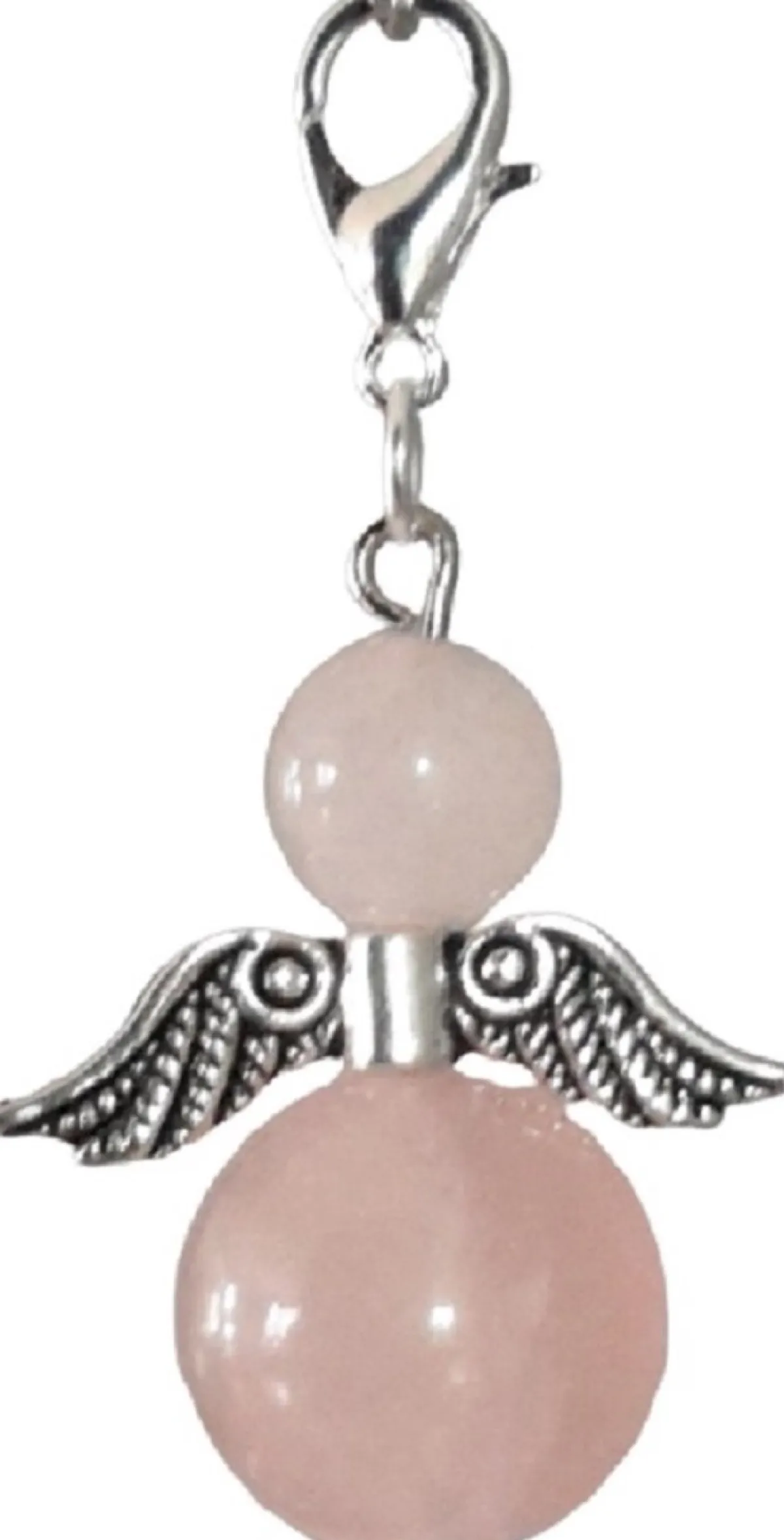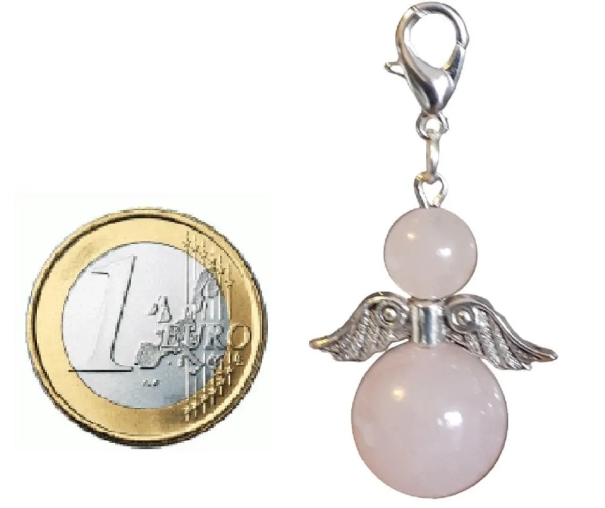 Handvervaardigde Kleine Beschermengel Welke Gemaakt Is Met Behulp Van Kralen Van De Halfedelsteen Rozenkwarts. De Onderste Kraal Heeft Een Diameter Van 14 Mm En De Bovenste Kraal Heeft Een Diameter Van 8 Mm.