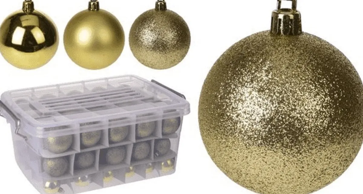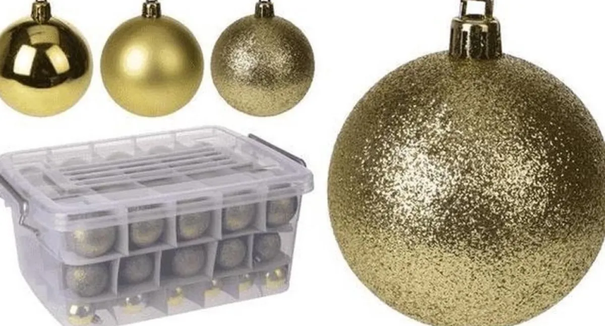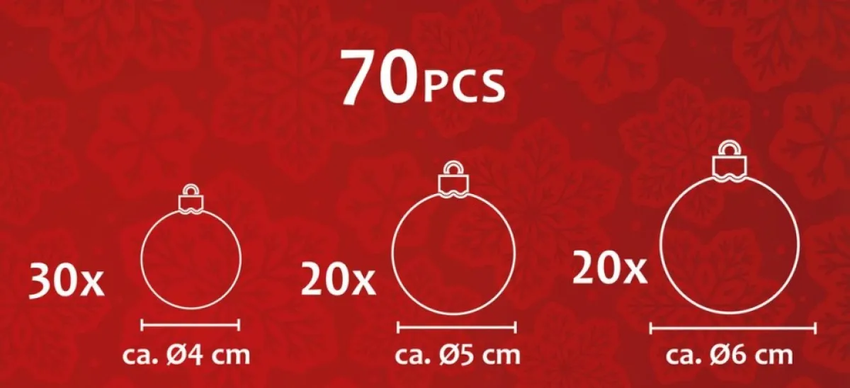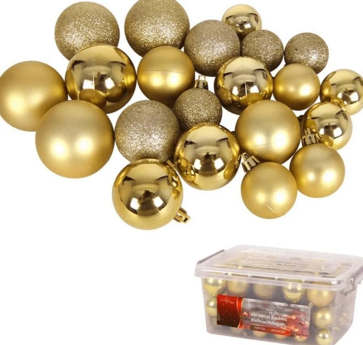 De Kerstballen Zijn Bedoeld Als Kerstversiering Voor Binnen. Ze Zijn Goud En Hebben Verschillende Texturen: Mat, Glanzend En Glitter. Ze Zijn Er In 3 Formaten Zodat Je Gevarieerd Kunt Decoreren. Je Krijgt Er 30 Met Een Doorsnede Van 4 Centimeter, 20 Met Een Doorsnede Van 5 Centimeter En 20 Met Een Doorsnede Van 6 Centimeter.