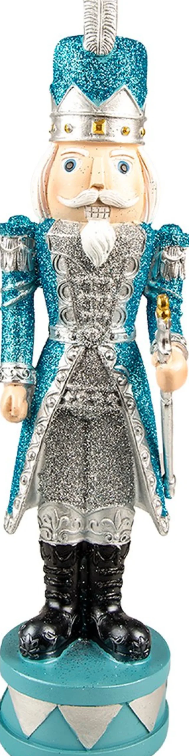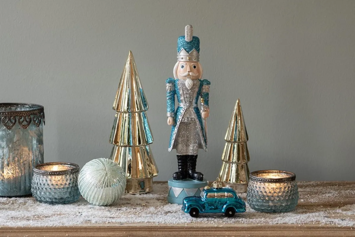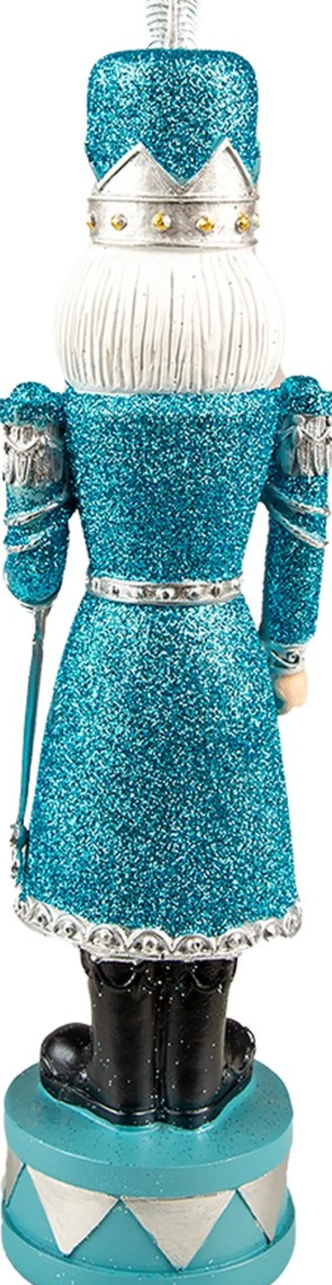 Decoratief Blauw Met Zilverkleurig Beeld Van Een Notenkraker Met Een Scepter In Zijn Hand. De Afmeting Is 8X8X30 Cm.