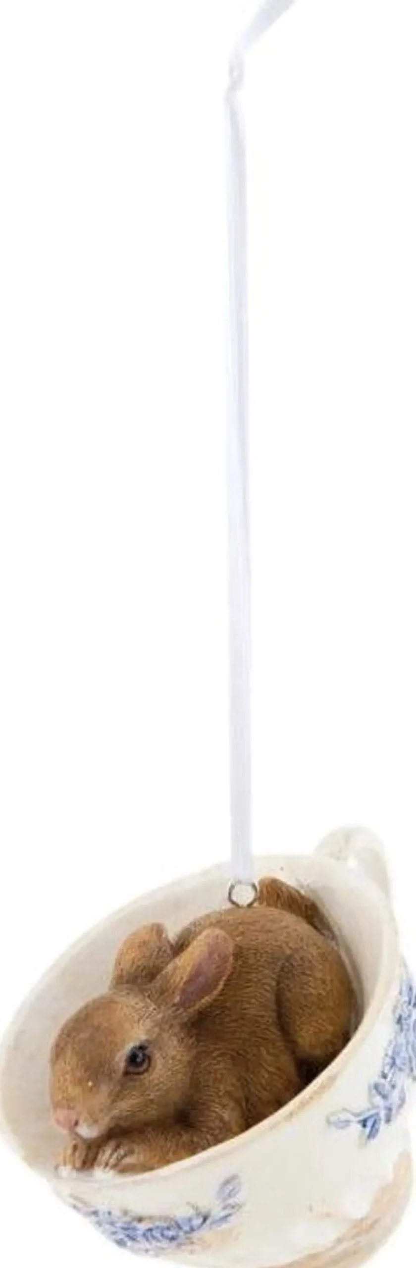 Kunststof Hanger Paasdecoratie Bruin Konijn In Een Wit Kopje Van Het Merk Clayre & Eef