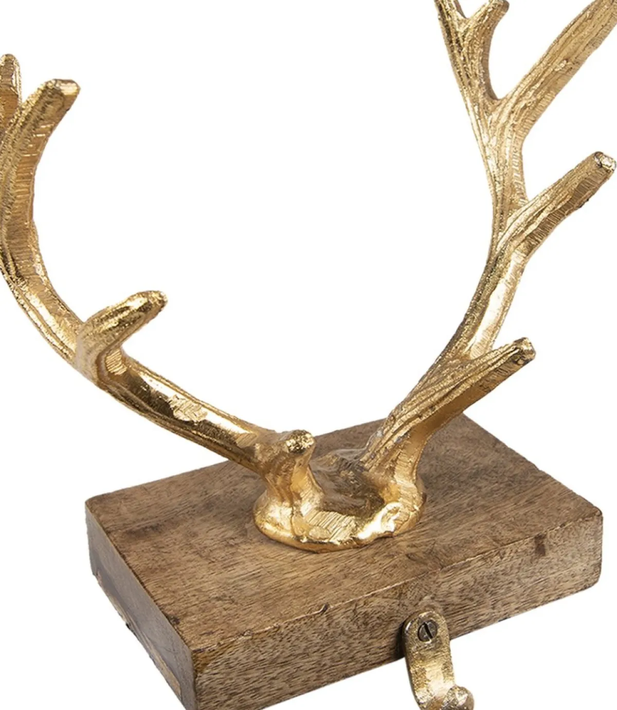 Goudkleurig Met Bruine Sokhanger Van Hout En Aluminium Met Een Gewei Erop, Van Het Merk Clayre & Eef.