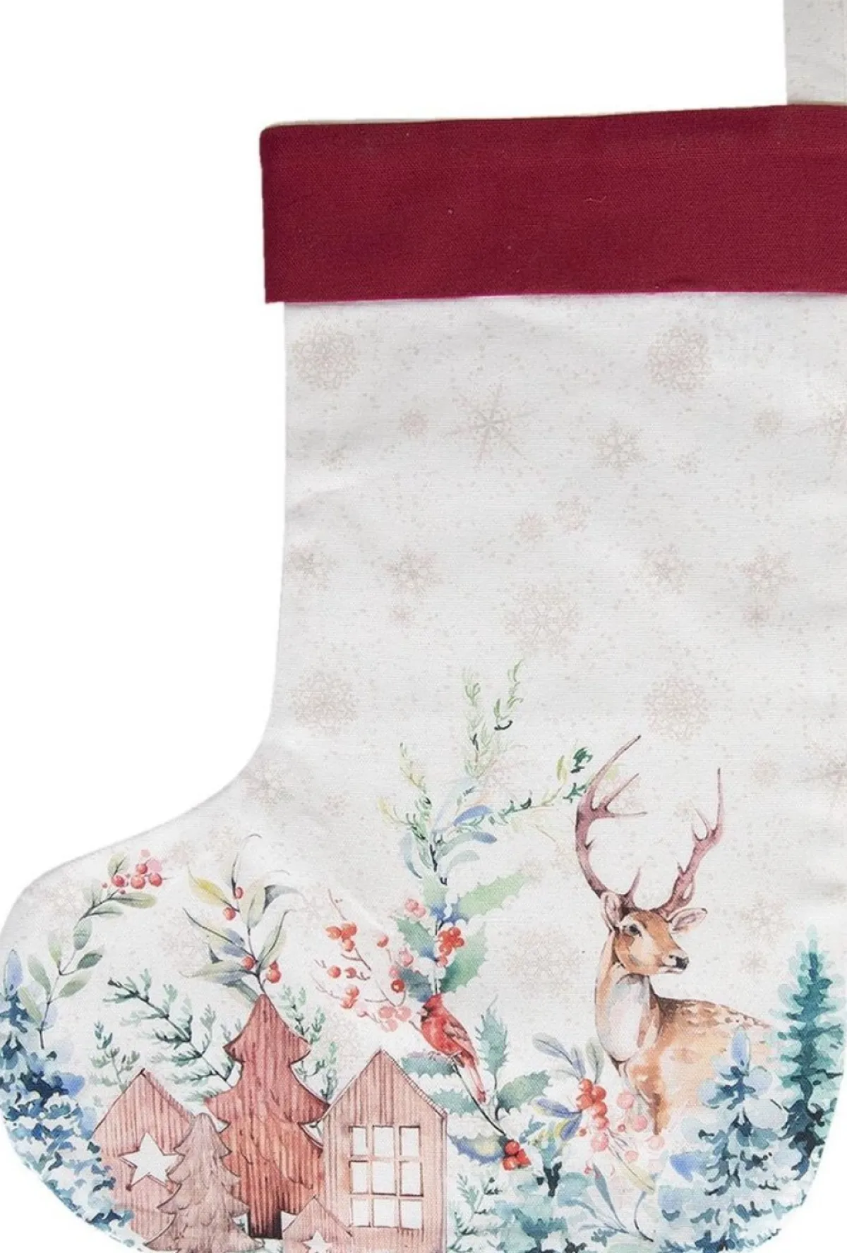 Landelijk Katoenen Kerstsok Met Rendier En Bomen Van Het Merk Clayre & Eef. Met Het Handige Lusje Kun Je De Sok Gemakkelijk Ergens Ophangen. Door Het Lichte Gewicht Kan Dit Overal!