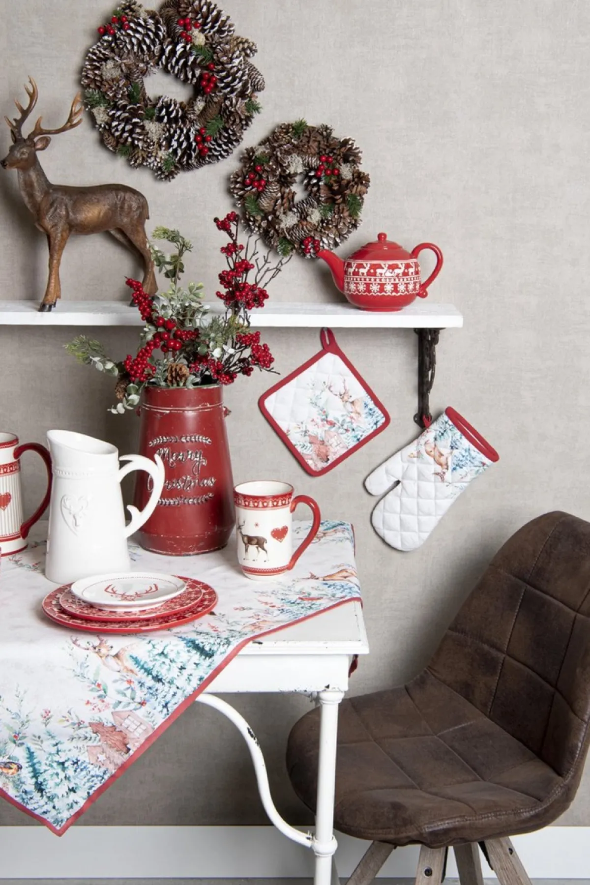 Tafelen Met Kerst Wordt Vanzelf Een Sfeervol Feest Met Deze Uitgebreide Textielserie. De Prachtig Geillustreerde Herten En Naaldbomen Geven Een Frisse Kijk Op De Traditionele Kerstsfeer. De Tafelkleden, Keukendoeken, Keukenschorten, Broodmanden, Pannenlappen En Ovenhandschoenen Zijn Mooie Voorbeelden Van Items Uit Deze Serie. Het Bijpassende Servies Zal De Kersttafel Compleet Maken En Zal Zorgen Voor Een Onvergetelijke Kerst. Merry Christmas!