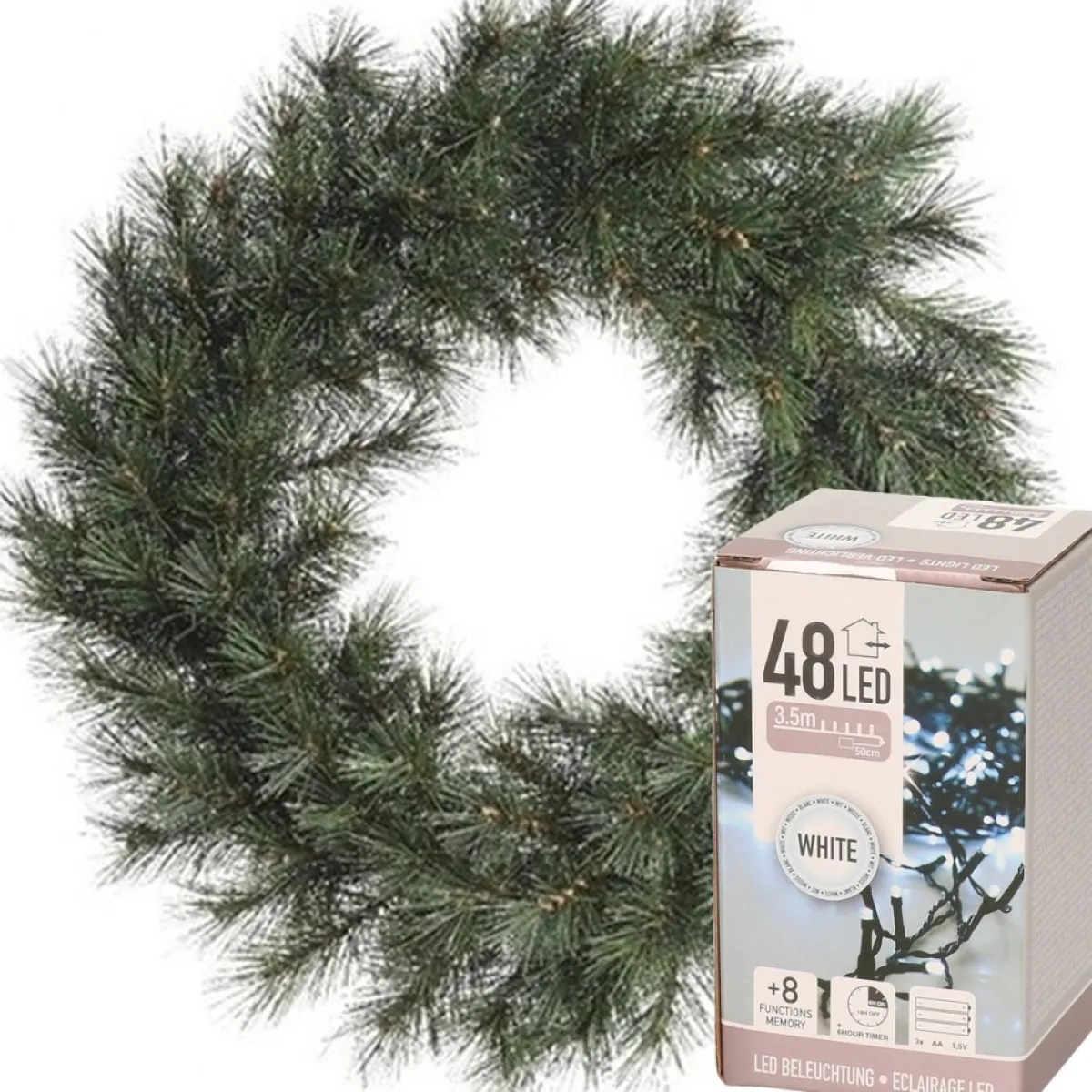 Kerstkrans/Dennenkrans Malmo 50 Cm Incl. Verlichting Helder Wit. Kerstkrans/Dennenkrans Inclusief Verlichting Helder Wit. Aantal Lampjes: 48. Lengte Lichtsnoer: 4 Meter. Formaat Krans: D50Cm.