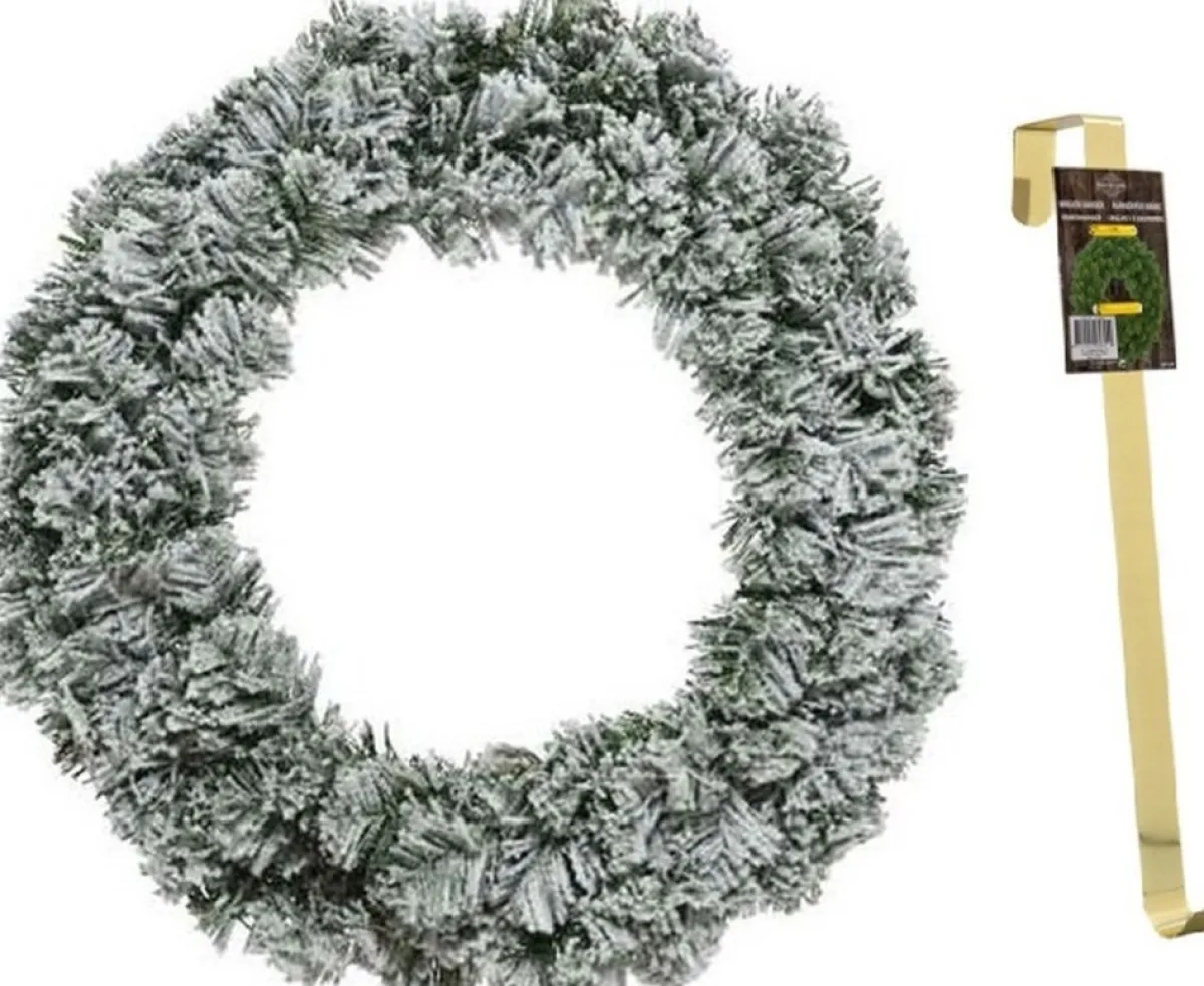 Groen/Witte Kerstkrans 60 Cm Imperial Met Kunstsneeuw En Met Gouden Hanger. Groene Kerstkrans Dennenkrans Met Witte Kunstsneeuw Op De Takken. Kerstkransen/Dennenkransen Voor Aan Uw Deur Of Ter Decoratie Boven De Schoorsteenmantel/Schouw. Materiaal: Kunststof/Plastic. Formaat Diameter: 60 Cm. Aantal Takjes: 200. Kleur: Groen/Wit. Inclusief Gouden Hanger 27 Cm Om Uw Kerstkrans Op Te Kunnen Hangen. Materiaal/Kleur: Messing.