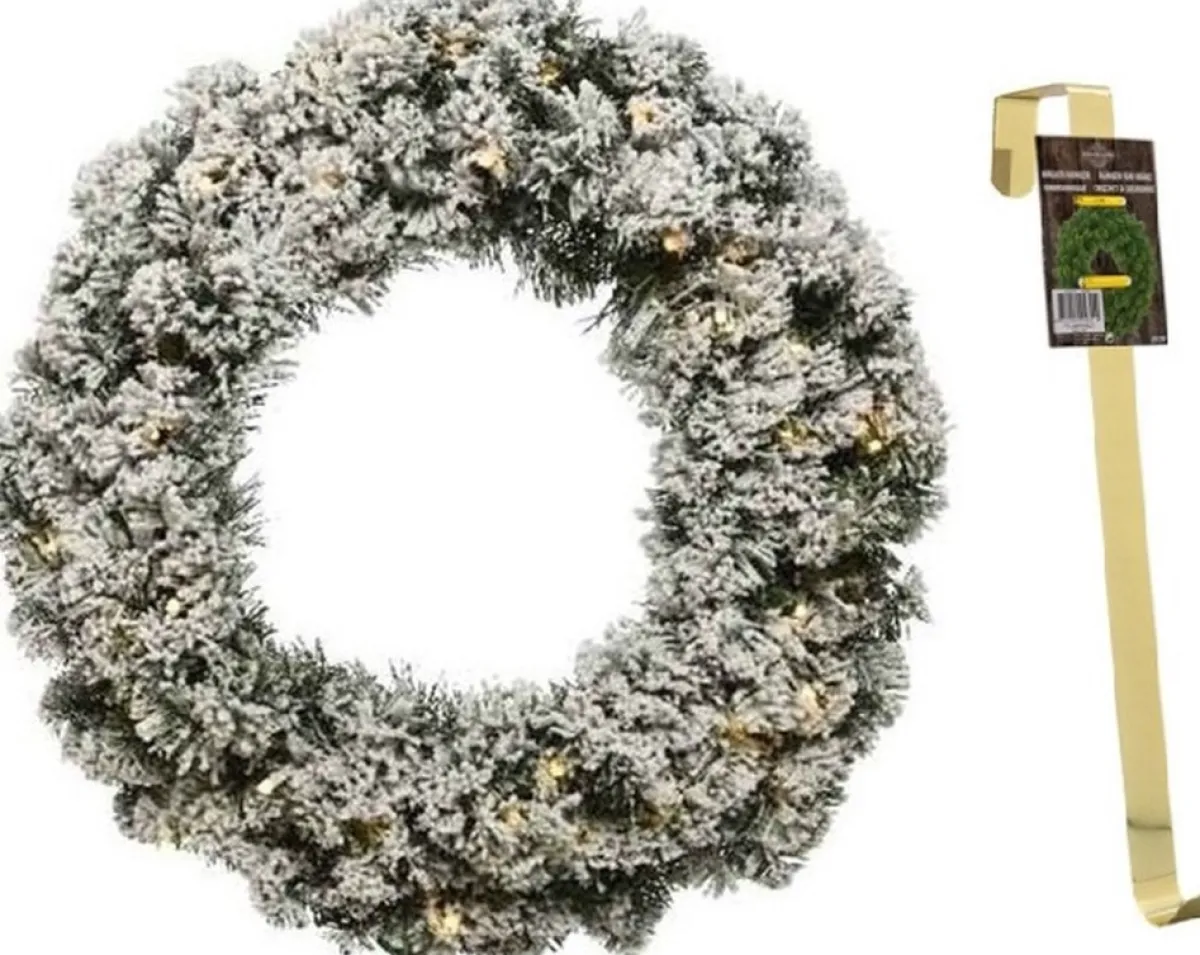 Groen/Witte Led Kerstkrans 60 Cm Imperial Met Kunstsneeuw En Met Gouden Hanger. Groene Kerstkrans Dennenkrans Met Witte Kunstsneeuw Op De Takken. Kerstkransen/Dennenkransen Voor Aan Uw Deur Of Ter Decoratie Boven De Schoorsteenmantel/Schouw. Incl. 40 Led-Lichtjes Met Timer Control. Materiaal: Kunststof/Plastic. Formaat Diameter: 60 Cm. Aantal Takjes: 200. Kleur: Groen/Wit. Inclusief Gouden Hanger 27 Cm Om Uw Kerstkrans Op Te Kunnen Hangen. Materiaal/Kleur: Messing.