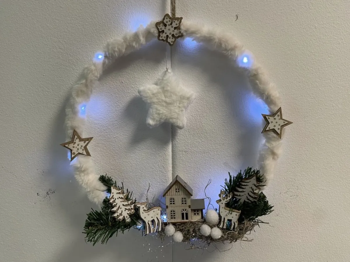 Kerst / Winter Krans In De Kleur Wit Met Verlichting. Baterijen Van De Verlichting Kunnen Vevangen Worden. Doorsnee 30 Cm.