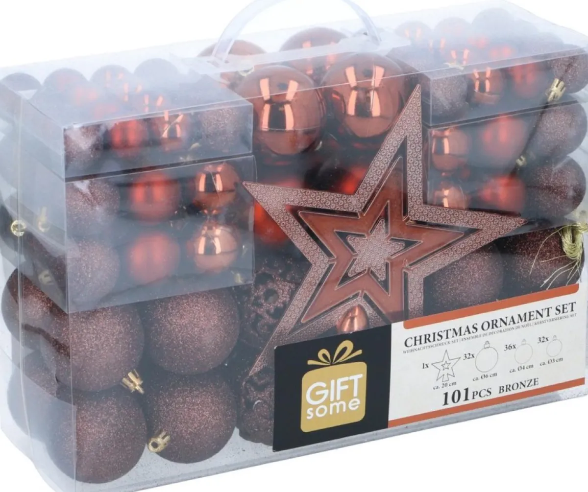 Met Deze Kerstversiering Set Gevuld Met Maar Liefst 101 Kunststof Kerstballen In Verschillende Maten En Texturen Maak Je Jouw Kerstboom In Een Handomdraai Klaar Voor De Feestdagen. Ga Voor Een Chique En Vintage Uitstraling Deze Kerst Met De Giftsome Kerstballen Set In Brons. Daarnaast Kun Je De Plastic Kerstballen Ook Gebruiken In Een Kerstkrans Of Als Kerst Decoratie In Een Mooie Lange Vaas. Vanwege Het Kunststof Materiaal Zijn De Kerstballen Vrijwel Onbreekbaar. Hierdoor Kun Je Ze Zowel Binnen Als Buiten Gebruiken En Zijn De Kerstballen Ook Uitermate Geschikt Voor Huishoudens Met Jonge Kinderen En/Of Huisdieren.