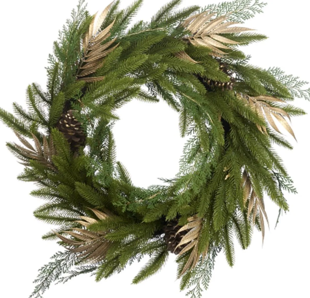 Mooie Krans Met Gouden Blad En Dennentakken In De Kleuren Groen Met Goud. De Krans Is 60 Cm En Is Een Blikvanger Aan Uw…