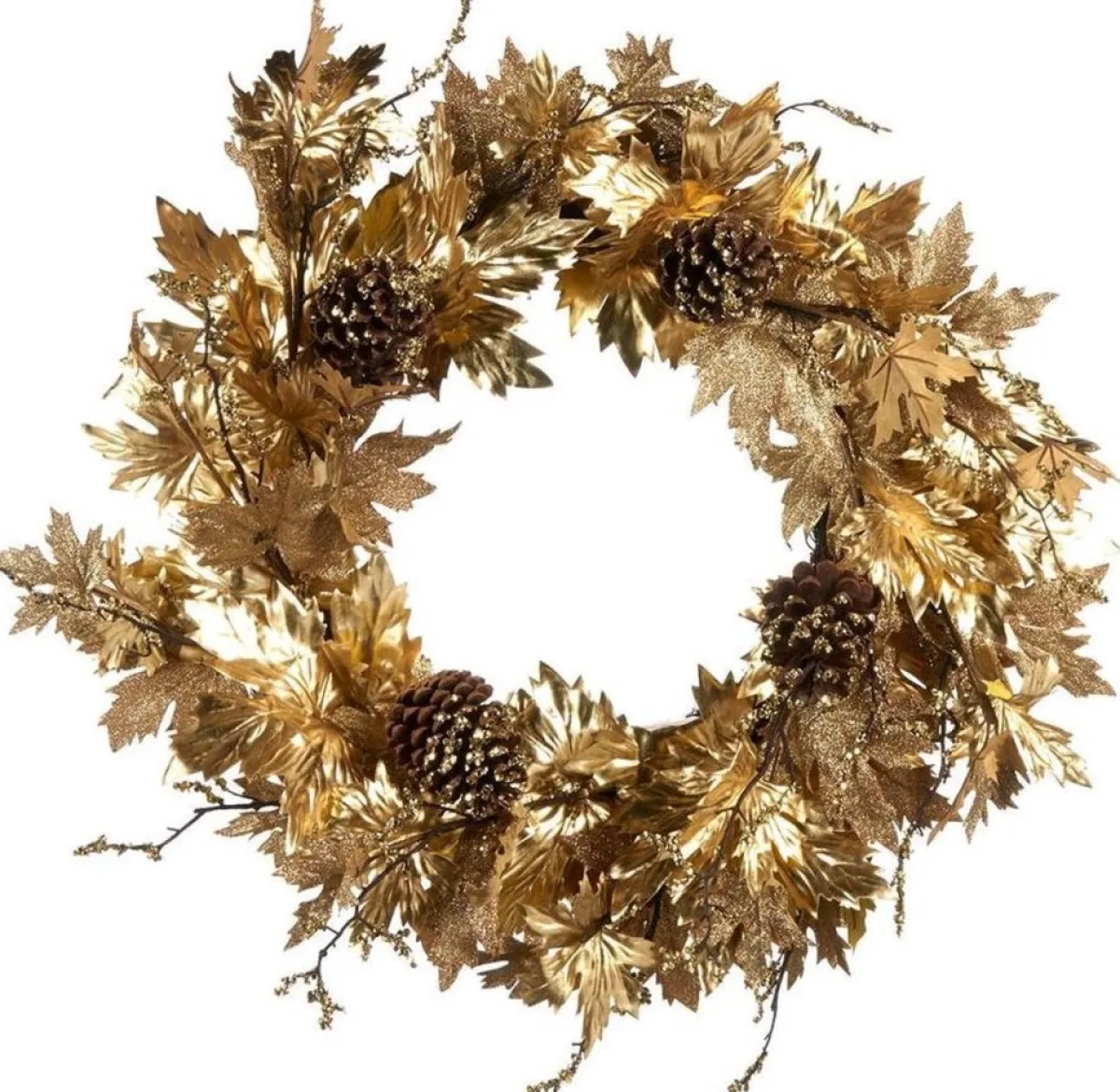 Goodwill Kerstkransen> Krans Landelijk Maple Leaf Zijde-Dennenappels Goud D 71 Cm
