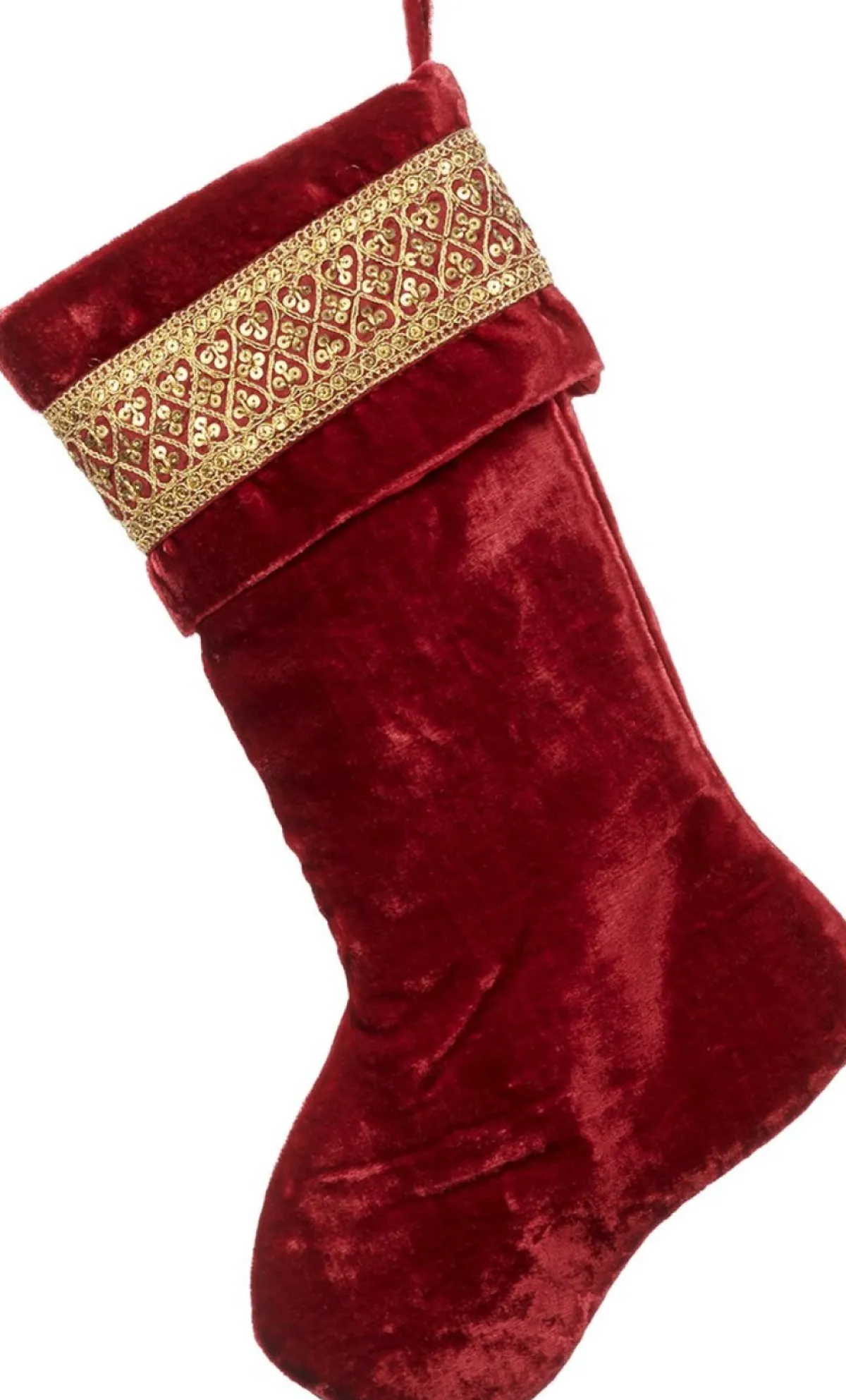Luxe Donkerrode Decoratie Kerstsok (Of In Het Engels Christmas Stocking) Gemaakt Van Velours En Afgewerkt Met Gouden Band En Gouden Pailletten, Van Het Belgische Lifestylemerk Goodwill.