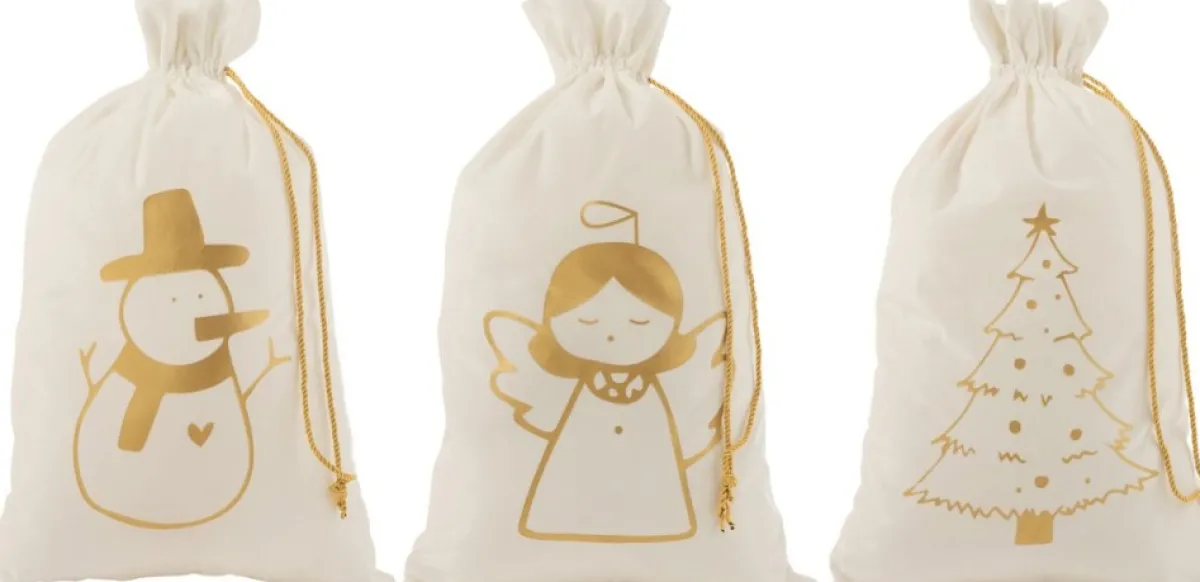 J-Line Kerstsokken> Zak Kerst Engel/Kerstboom/Sneeuwman Velvet Wit/Goud Large Assortiment Van 3
