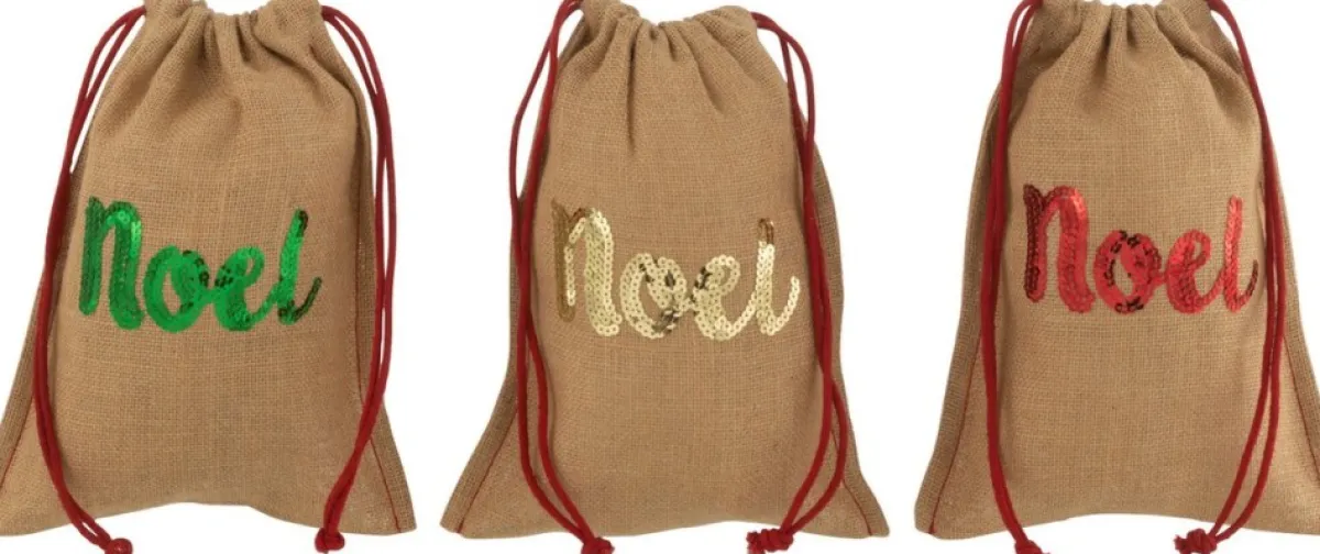J-Line Kerstsokken> Zak Noel Pailletten+Trekkoord Jute Naturel Assortiment Van 3