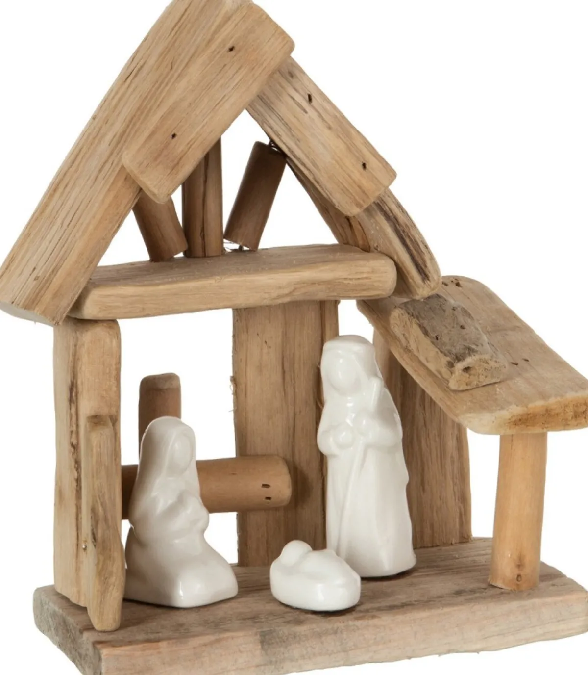J-Line Kerststallen> Kerststal Huis Hout/Keramiek Naturel/Wit