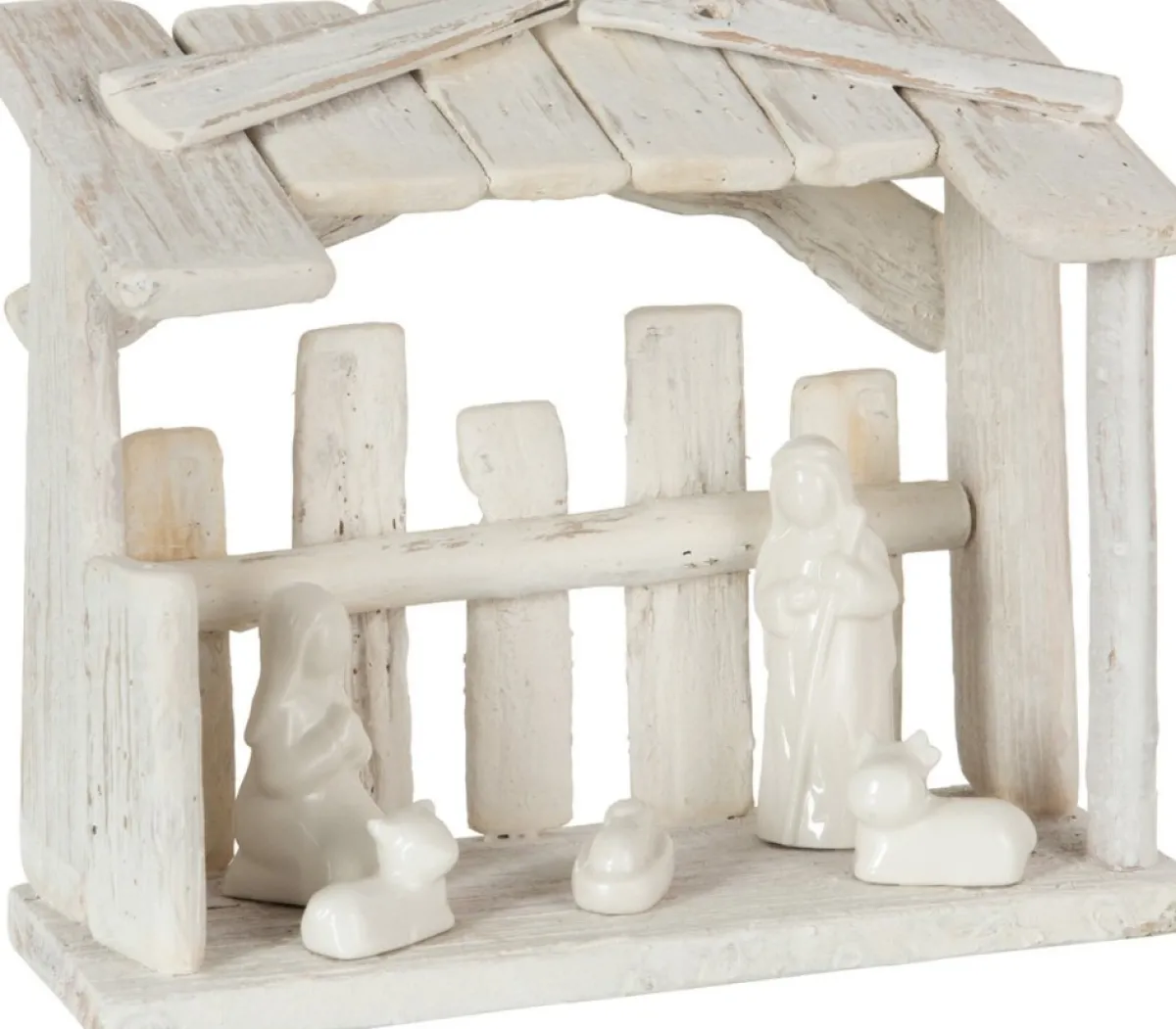 J-Line Kerststallen> Kerststal Plat Dak Hout/Keramiek Wit