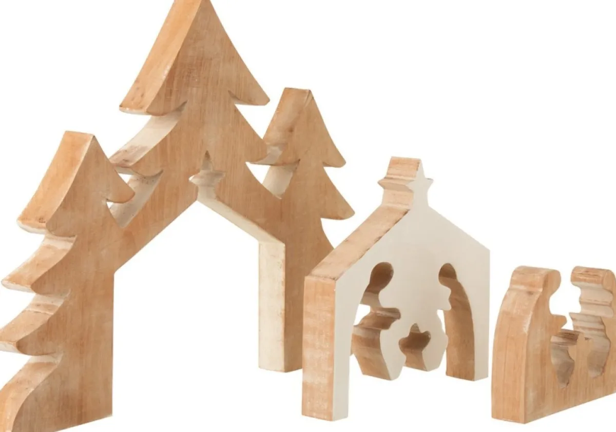 J-Line Kerststallen> Kerststal+Kerstbomen Puzzle Mango Hout Wit/White Wash