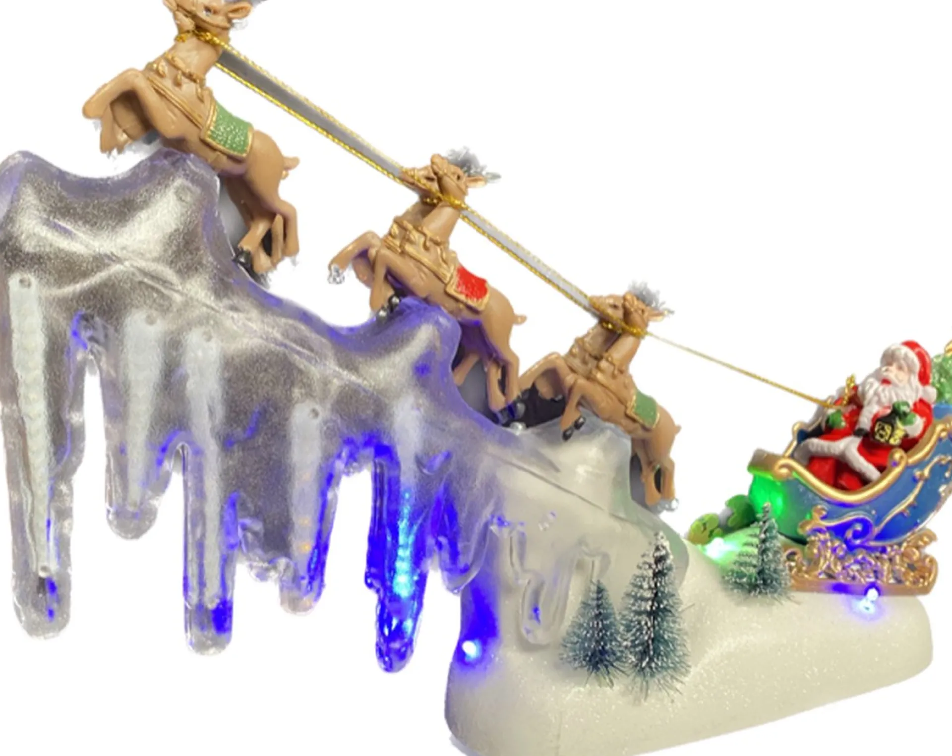 Kerstbeeld Van Een Kerstman In Een Slee , Voortgetrokken Door 6 Rendieren , Klaar Om De Lucht In Te Gaan . De Rendieren Stijgen Op Vanaf Een Doorzichtige “Ijsschots” Die Verlicht Wordt Door Gekleurde Snowfall Ledverlichting . Juist De Vallende Lichtjes In De Ijsschots Maken Dit Tafereel Extra Opvallend .