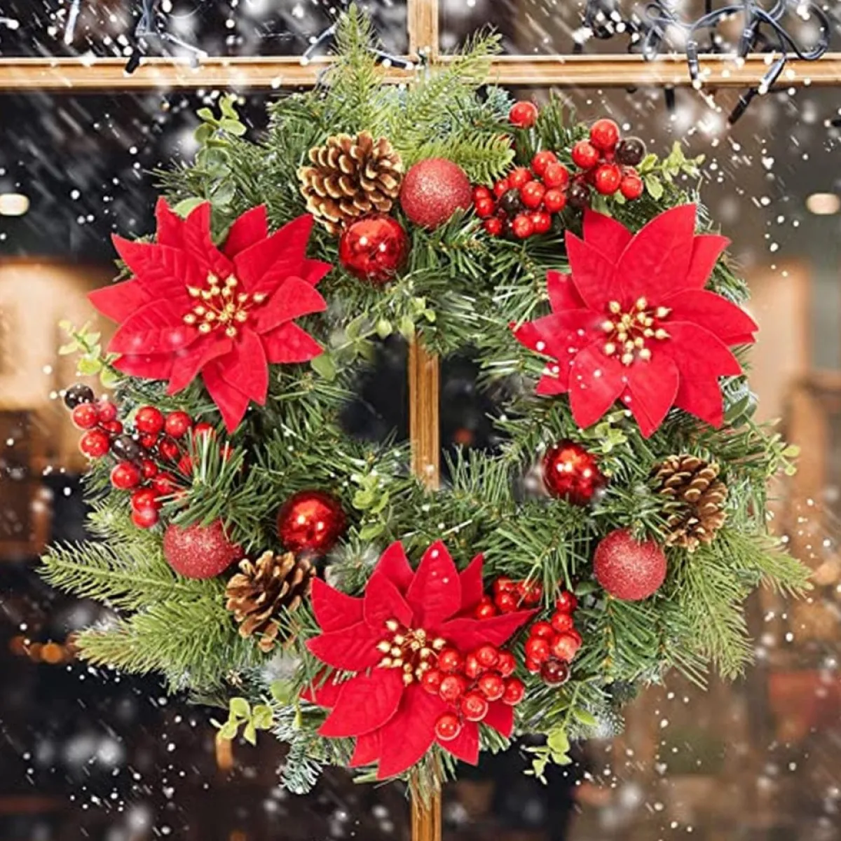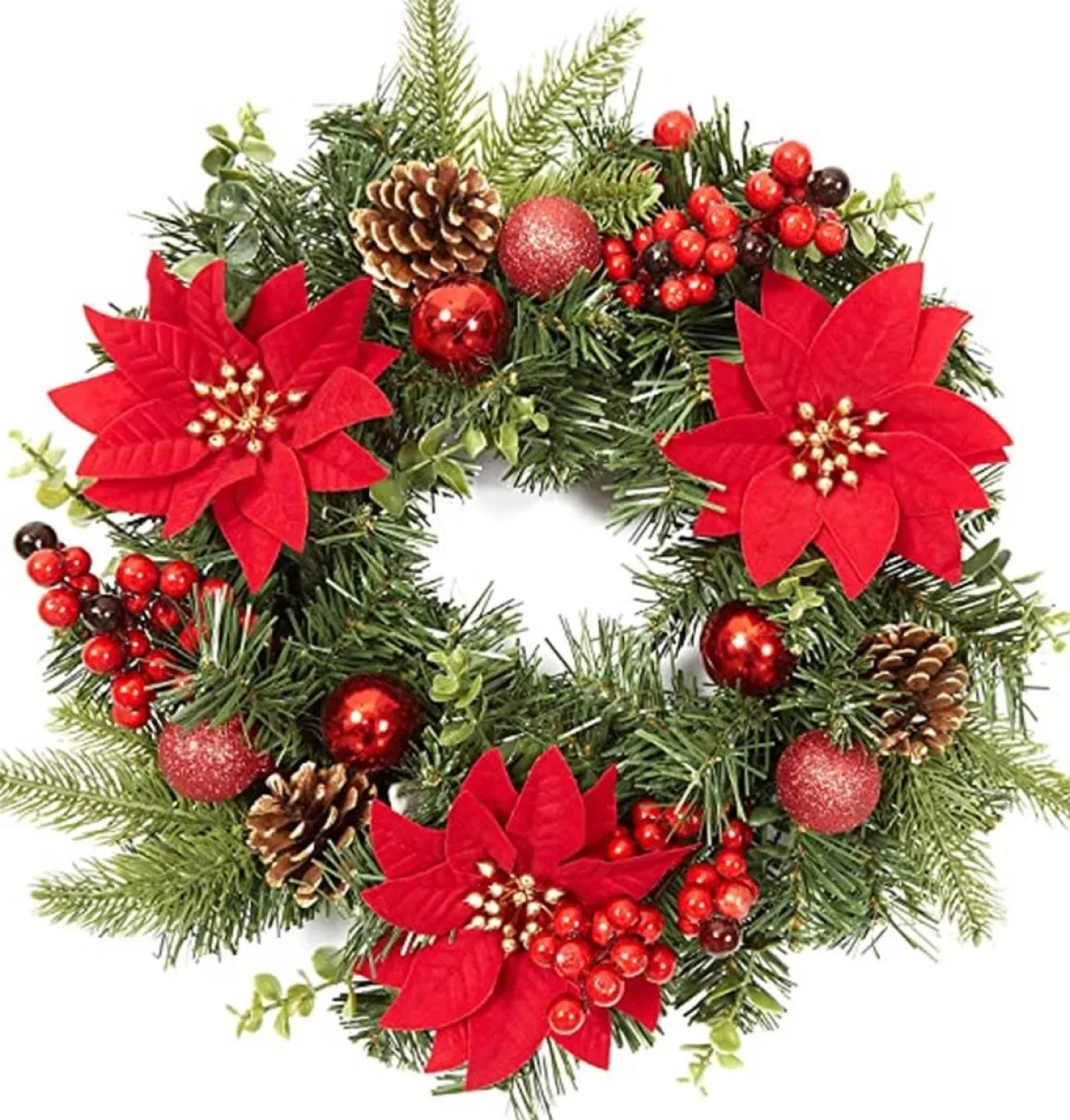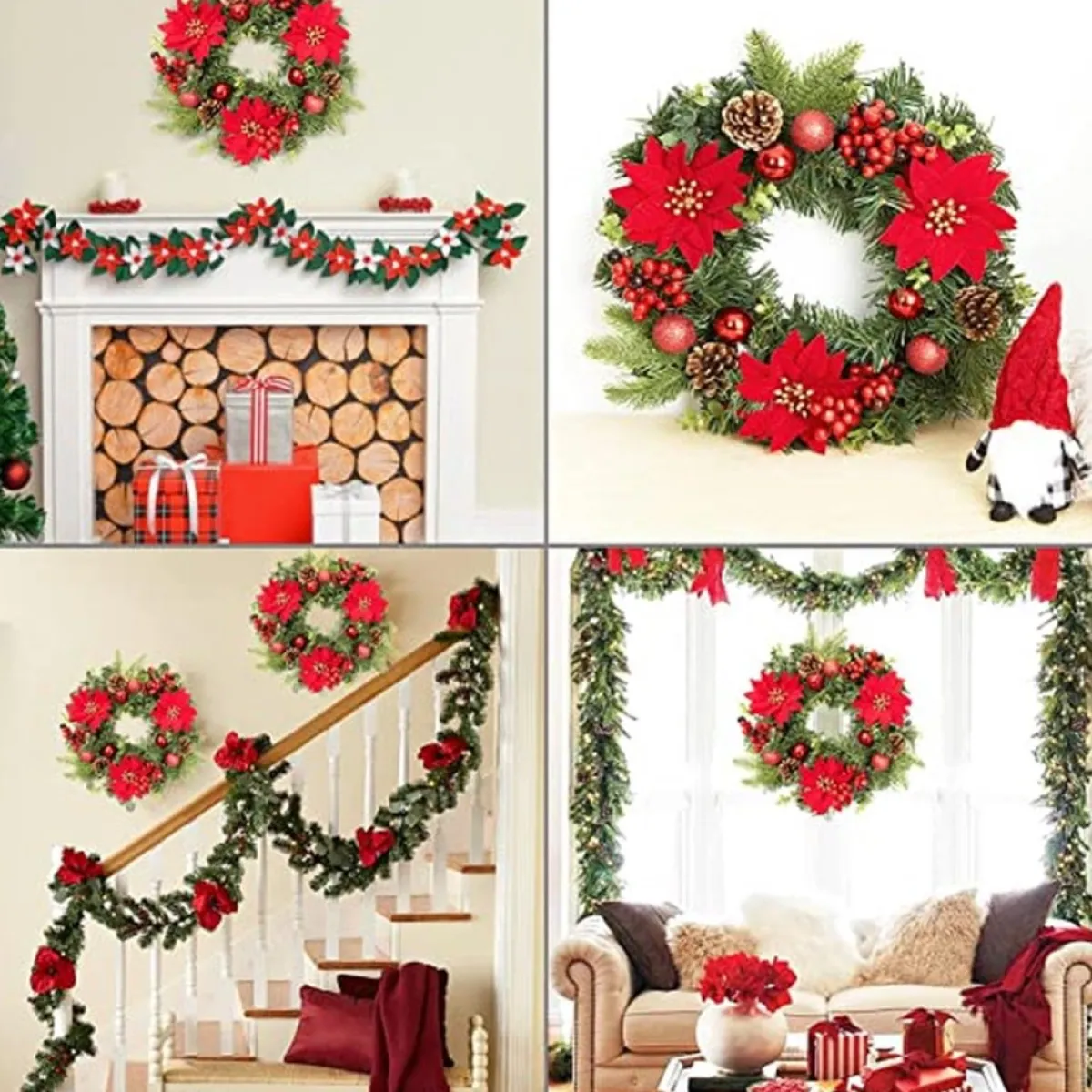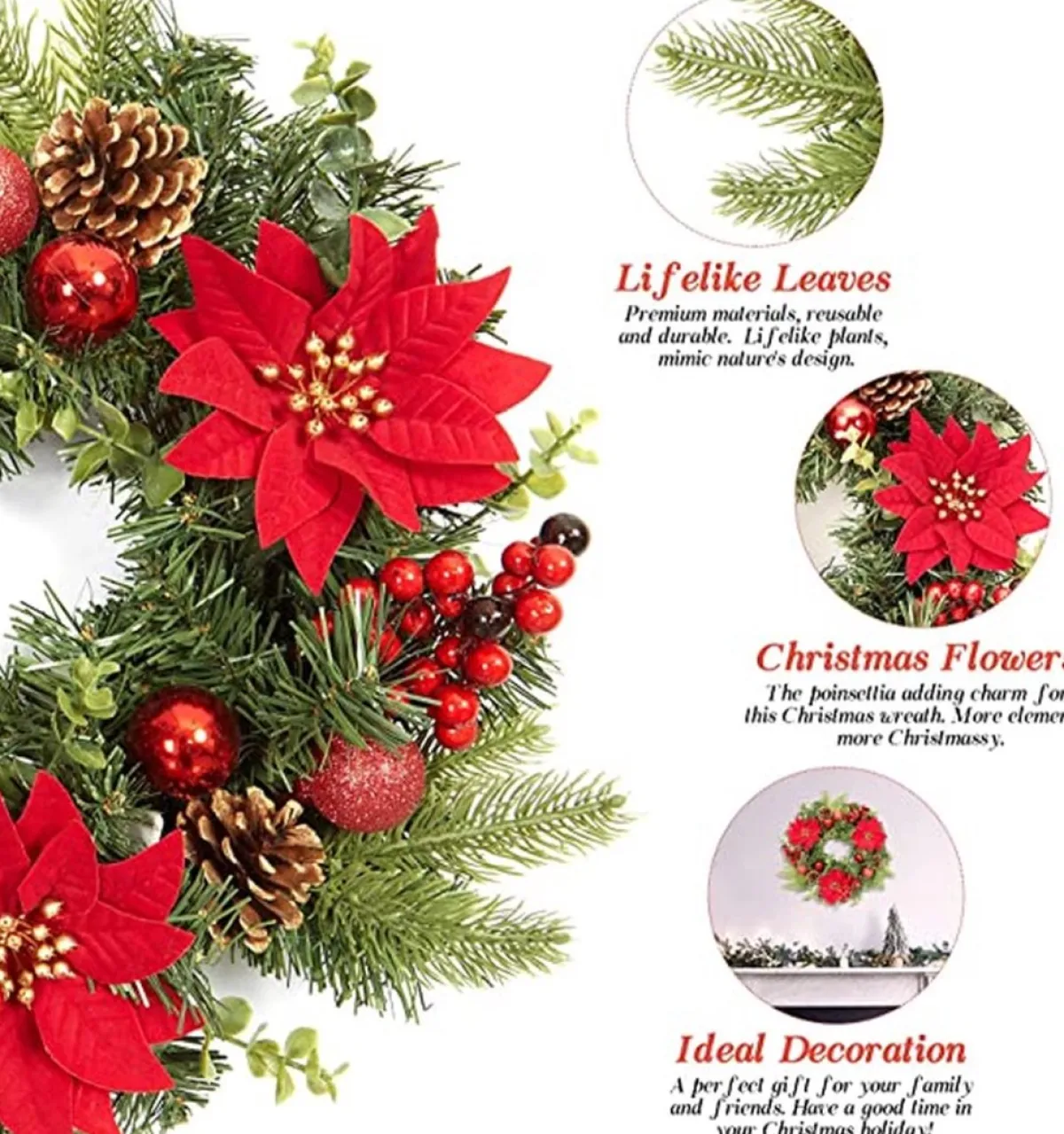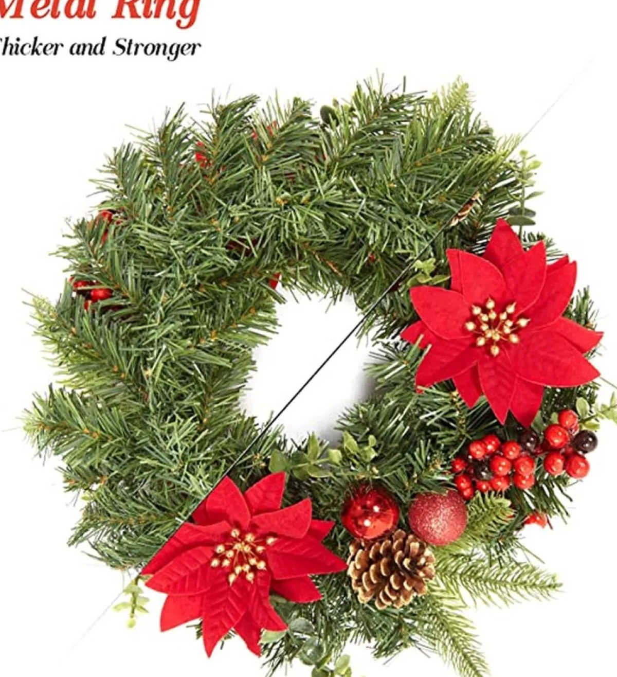 - High Quality: This Wreath Is Made Of Premium Eco-Friendly Pvc, Plastic, Eps And Cloth. The Double Metal Ring Makes It Stronger And Durable. The Artificial Christmas Flower Is Made Of High Quality Cloth, Which Is Not Easy To Fade. No Extra Maintenance Required.