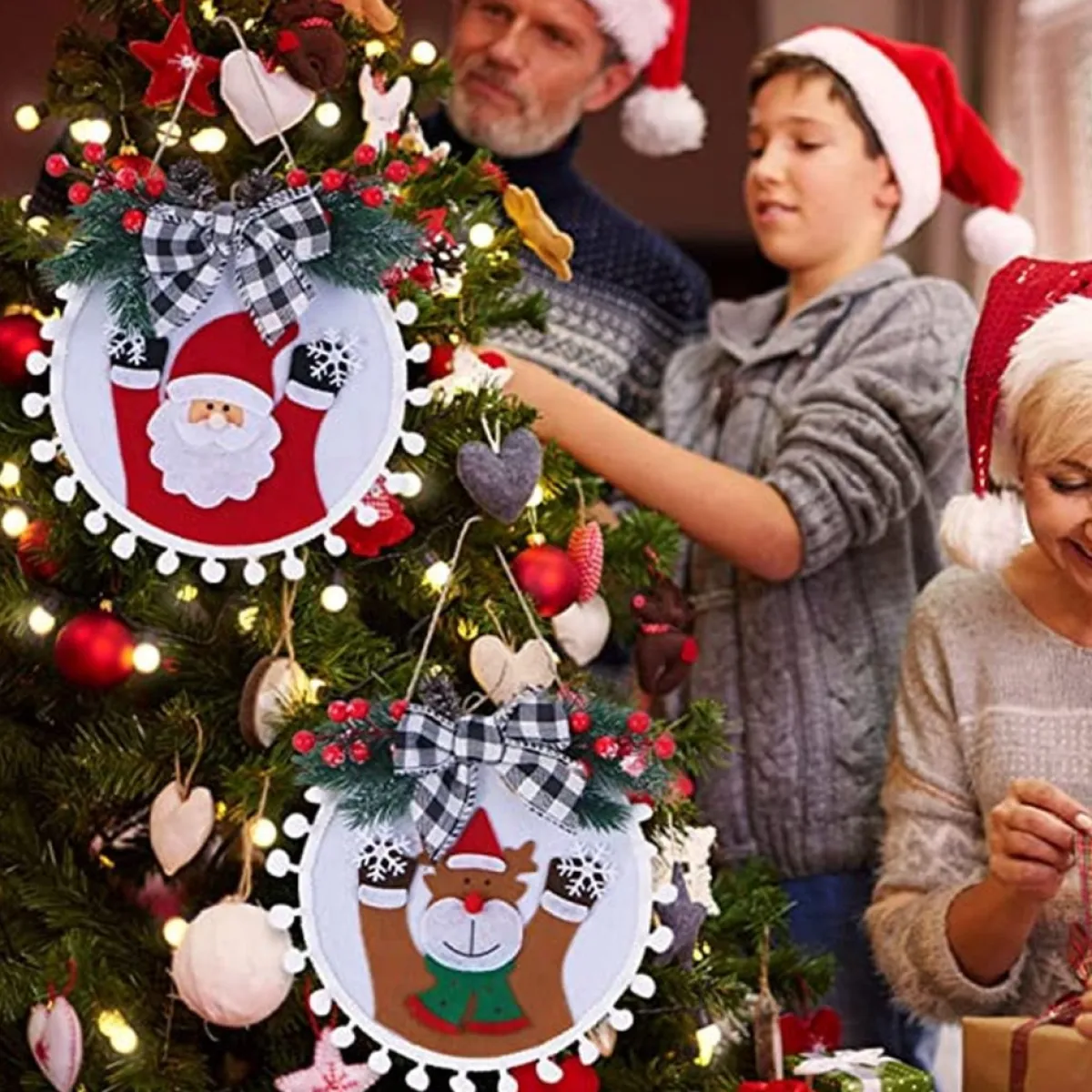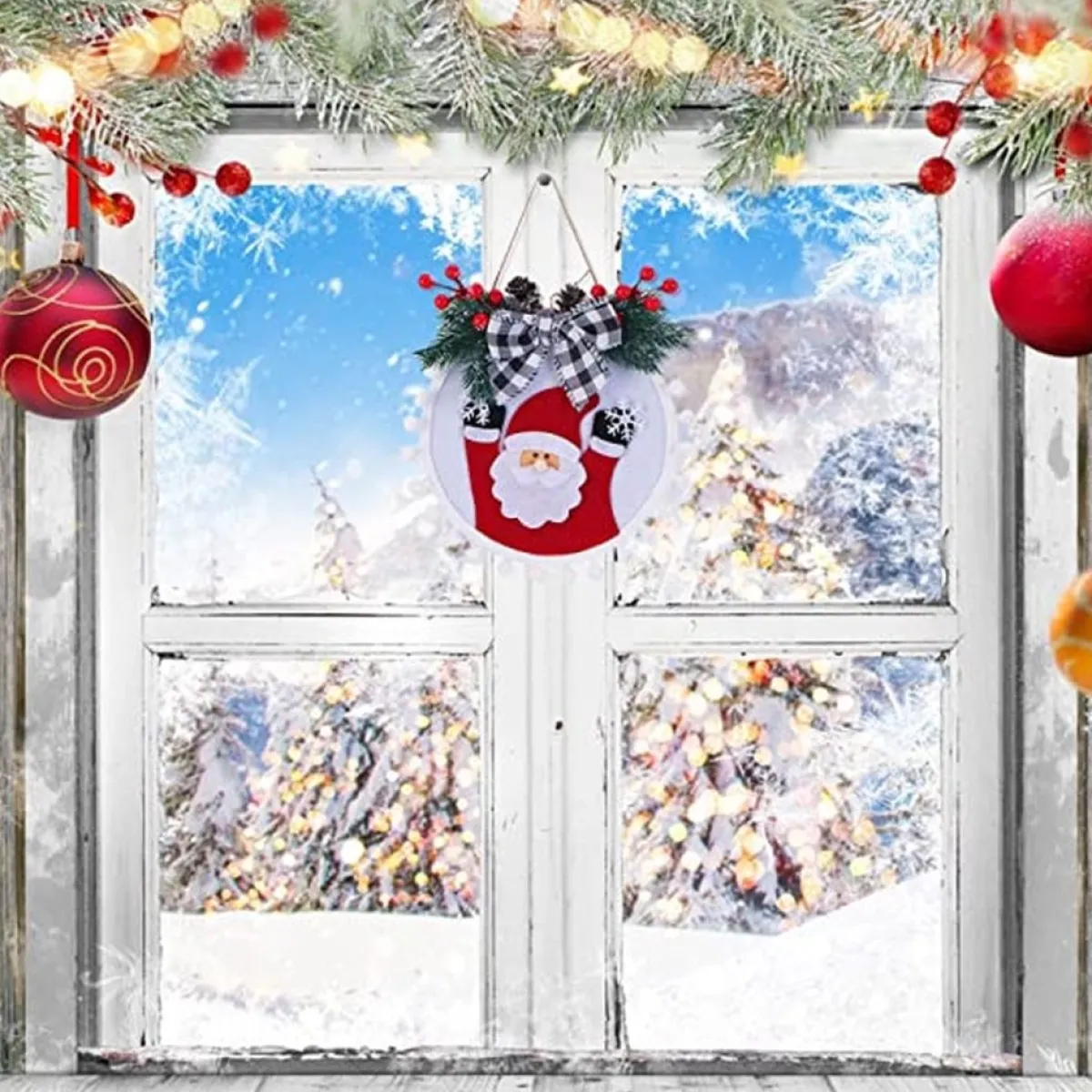 - Ideal Decoration: Christmas Wreath With Santa Claus, Reindeer, Bow, Red Berries, Snowflakes, Pine Branches, Pine Cones, Lanyards, Hairballs. Create A Wonderful Christmas Atmosphere.