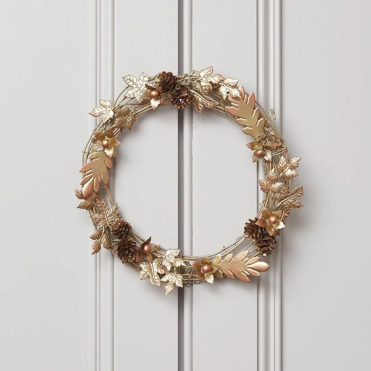 - Inhoud: 1 X Kerstdeurkrans Met Gouden Bladeren En Dennenappels