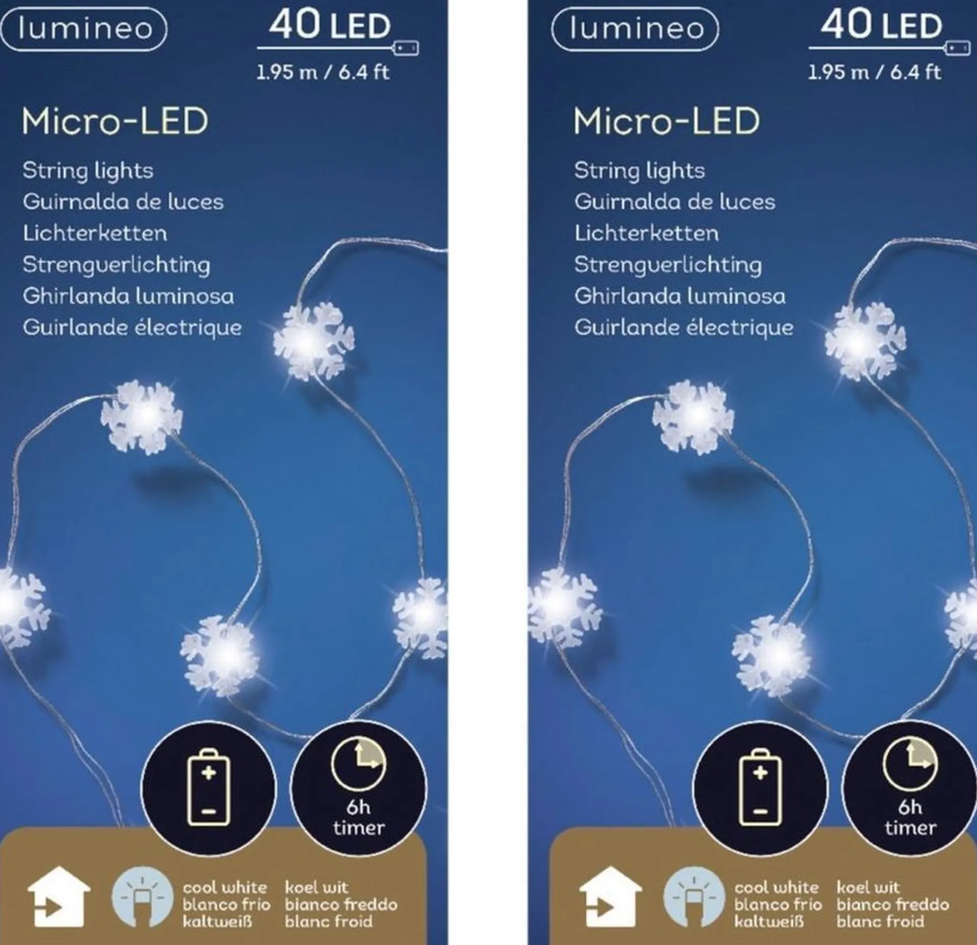 2X Stuks Sneeuwvlokken Lichtsnoeren Met Timer 40 Lampjes Wit Op Batterij. Led Sneeuwvlok Kerstversiering Lichtsnoer Van 195 Cm Inclusief 6 Uur Timer. Deze Sneeuwvlok Lichtsnoer Werkt Op 3X Aa Batterij (Niet Inbegrepen).