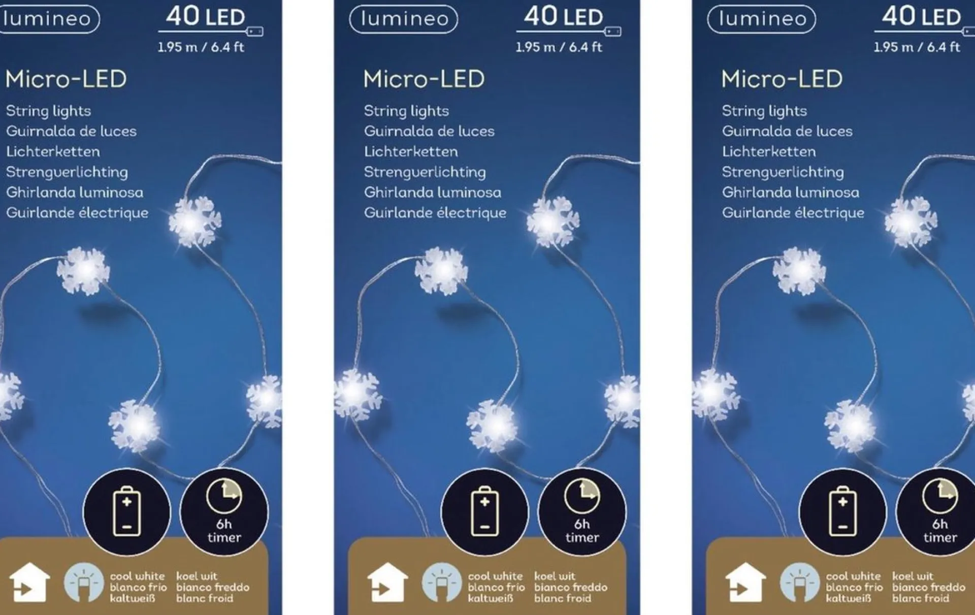 3X Stuks Sneeuwvlokken Lichtsnoeren Met Timer 40 Lampjes Wit Op Batterij. Led Sneeuwvlok Kerstversiering Lichtsnoer Van 195 Cm Inclusief 6 Uur Timer. Deze Sneeuwvlok Lichtsnoer Werkt Op 3X Aa Batterij (Niet Inbegrepen).