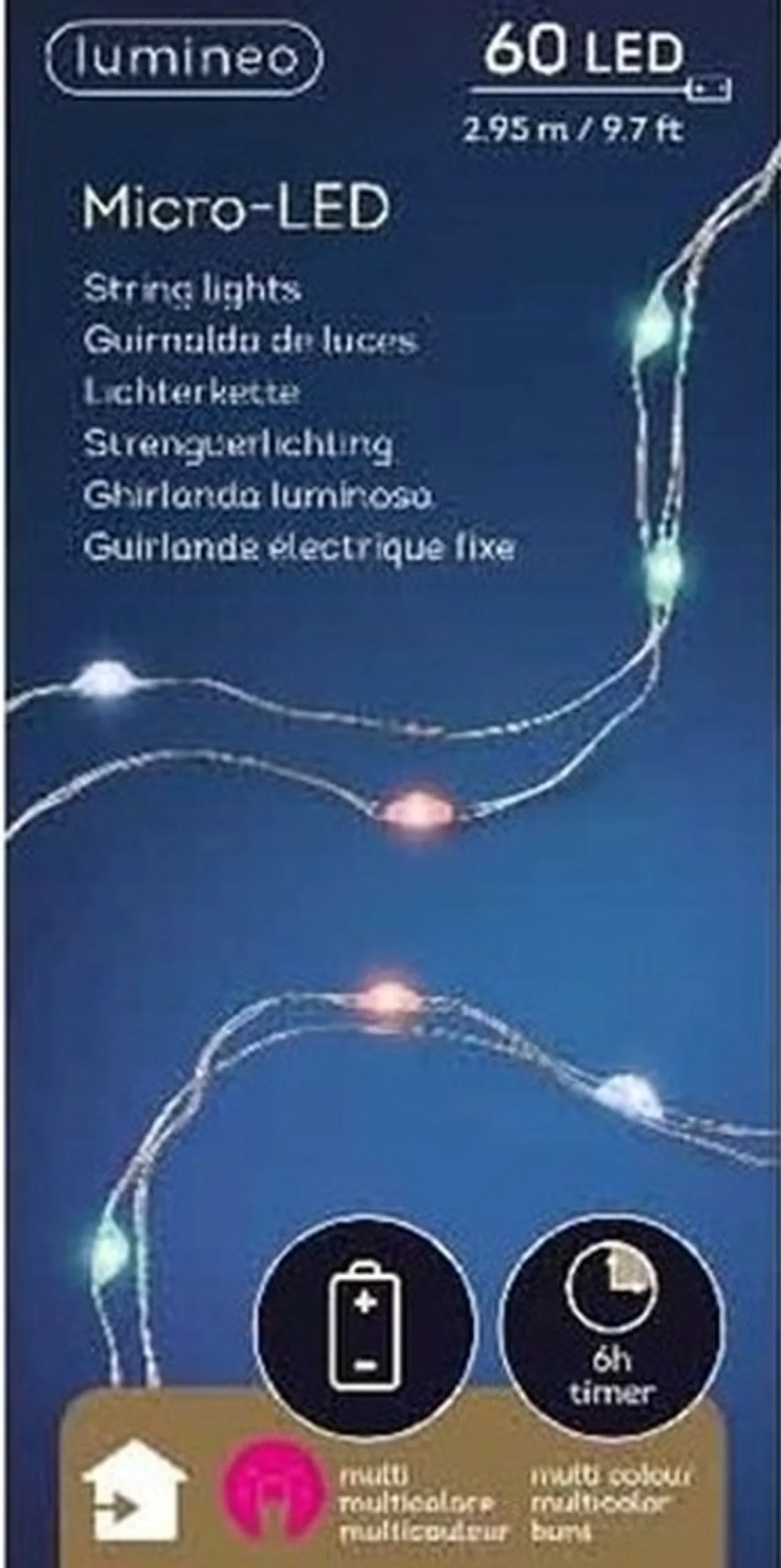 Micro Kerstverlichting Op Batterij Gekleurd Binnen 60 Lampjes. 60 Lampjes Met Zilveren Draad Inclusief Batterijhouder. De Afstand Tussen De Lampjes Is Circa 5 Cm. De Afstand Tussen De 1E En De Laatste Lamp Is Circa 295 Cm. Excl: 3 X Aa Batterijen. Branduren: Circa 48 Uur. Ce Niet Vervangbare Lamp.