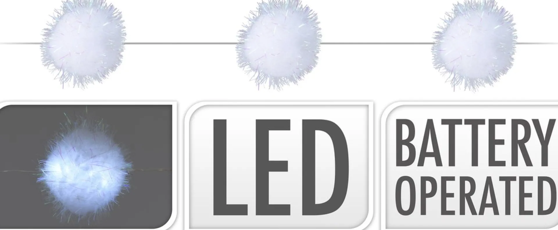 1X Led Lichtsnoeren Met 20 Sneeuwballen Lampjes Op Batterijen 190 Cm. Deze Lichtslinger Heeft 20 Sneeuwballen Lampjes. Lengte: 190 Cm. Diameter Sneeuwbal: 5 Cm. Kleur Licht: Warm Wit. Deze Lichtsnoer Heeft Een Timer Functie: 6 Uur Aan, 18 Uur Uit. Voeding: 2X Aa Batterijen (Niet Inbegrepen). Aanloopsnoer: 30 Cm.