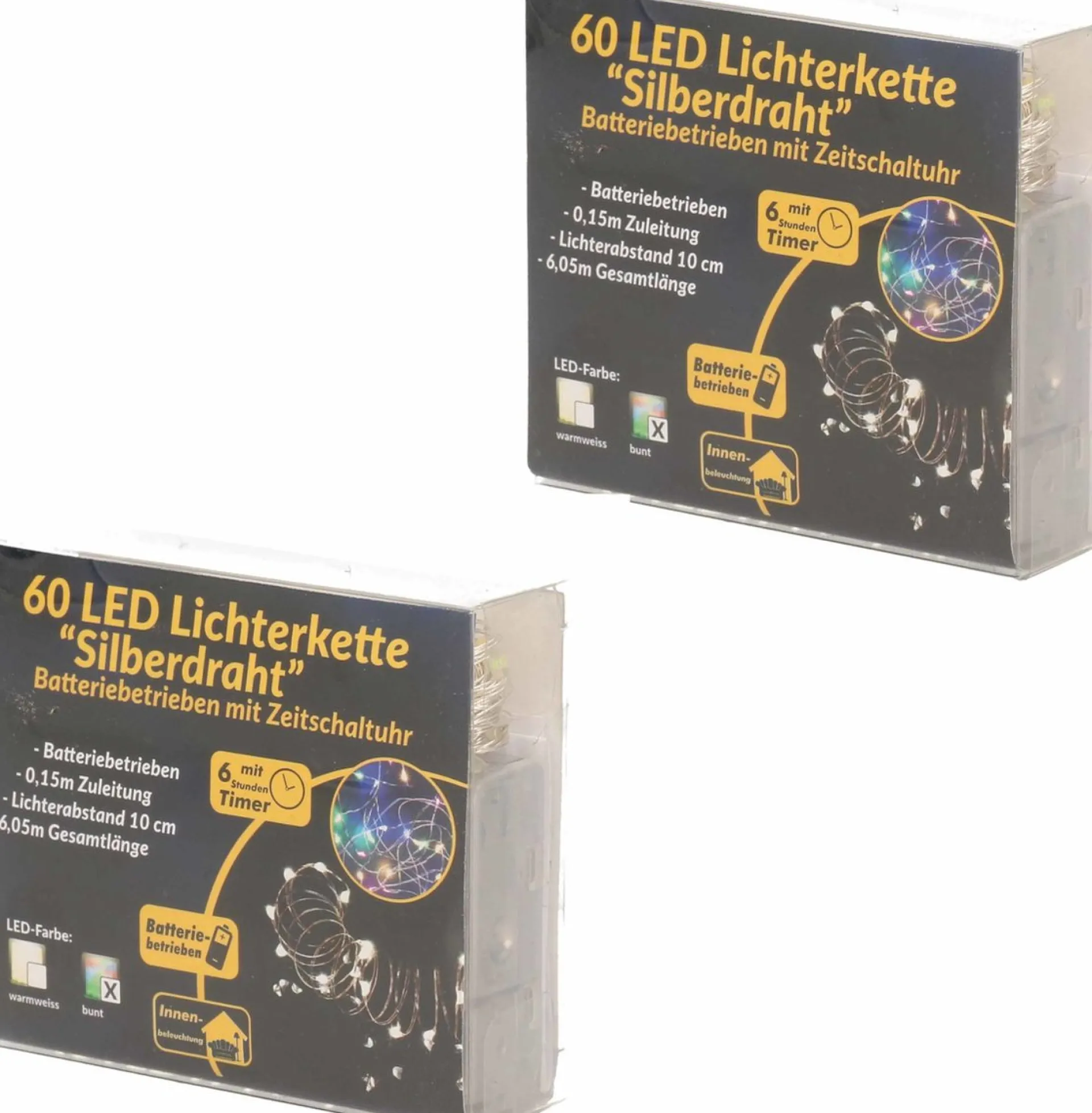 Merkloos 2X Draadverlichting Zilver Met Gekleurde Led Lampjes 6 Meter Op Batterijen Met Timer – Kerstverlichting Lichtsnoeren Online