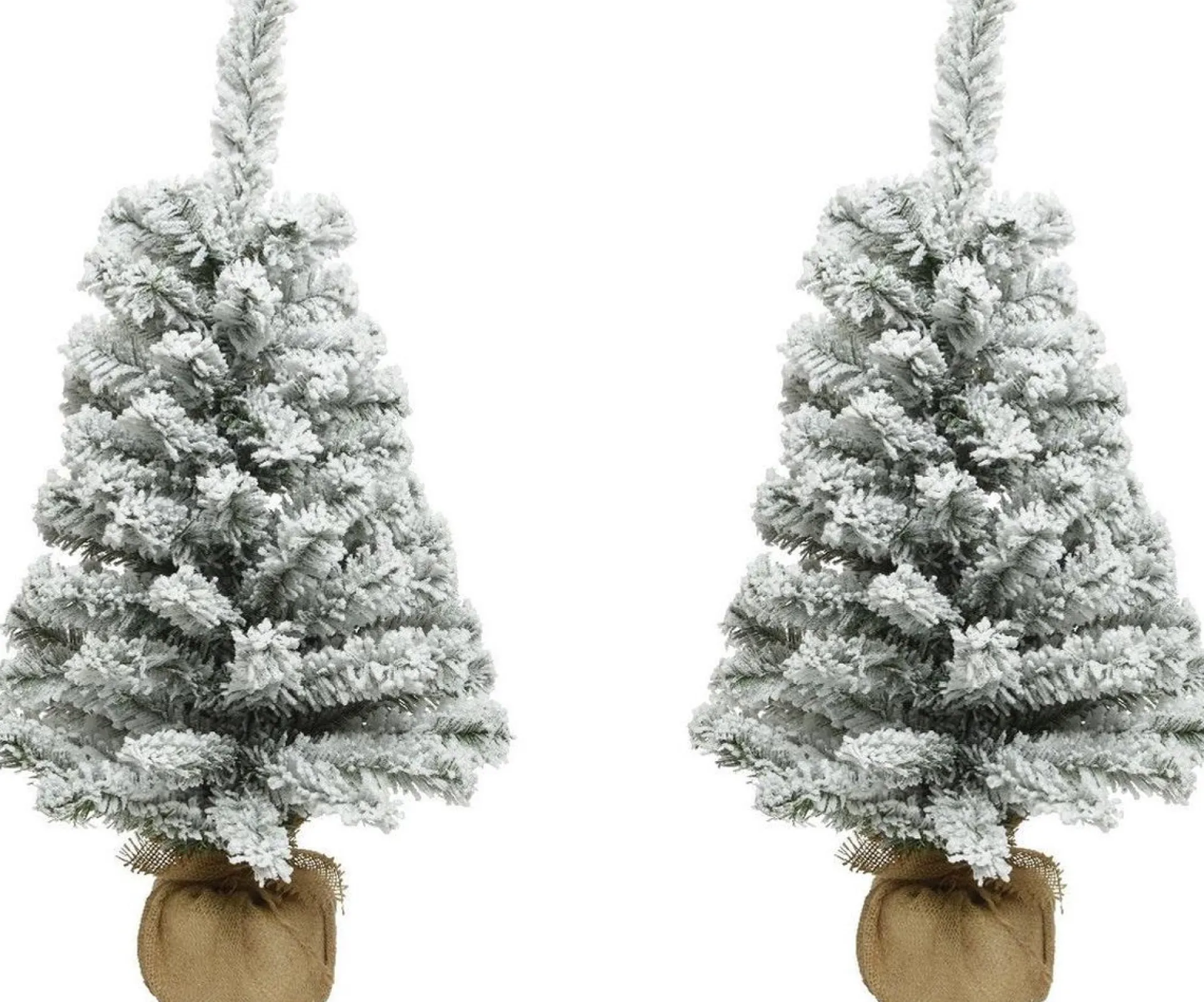 2X Stuks Kunstboom/Kunst Kerstboom Met Sneeuw 90 Cm. Voet: Jute Zak. Hoogte Boompje: 90 Cm. Diameter Boompje: 46 Cm. Kunst Kerstbomen/Kunstbomen/Boompjes Kerstversiering.