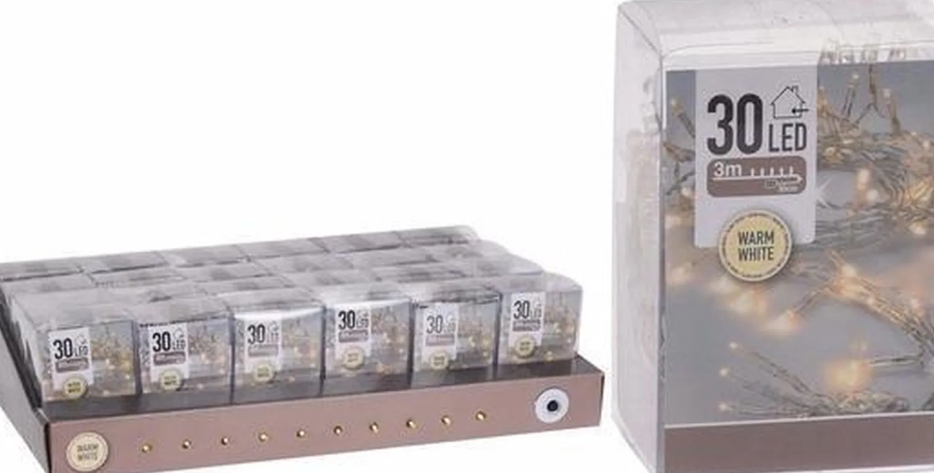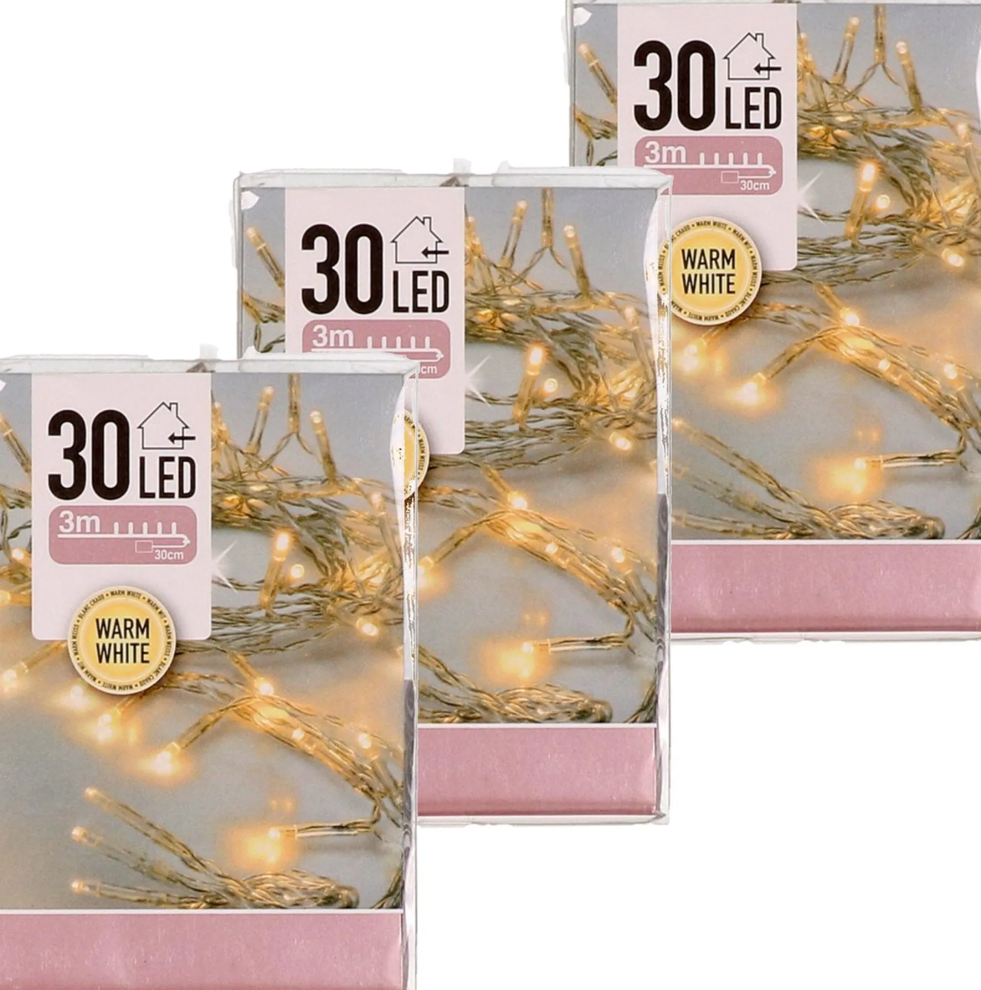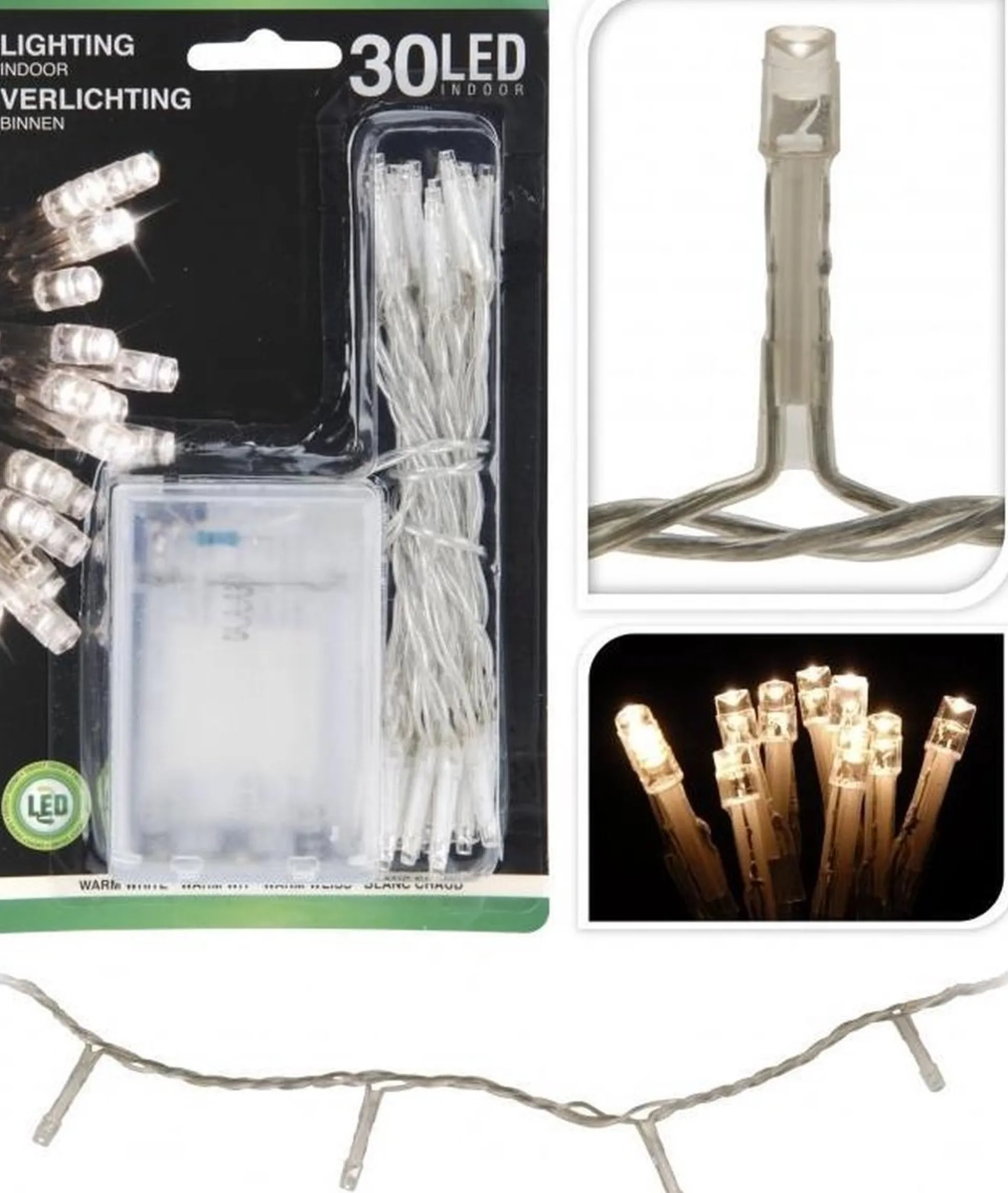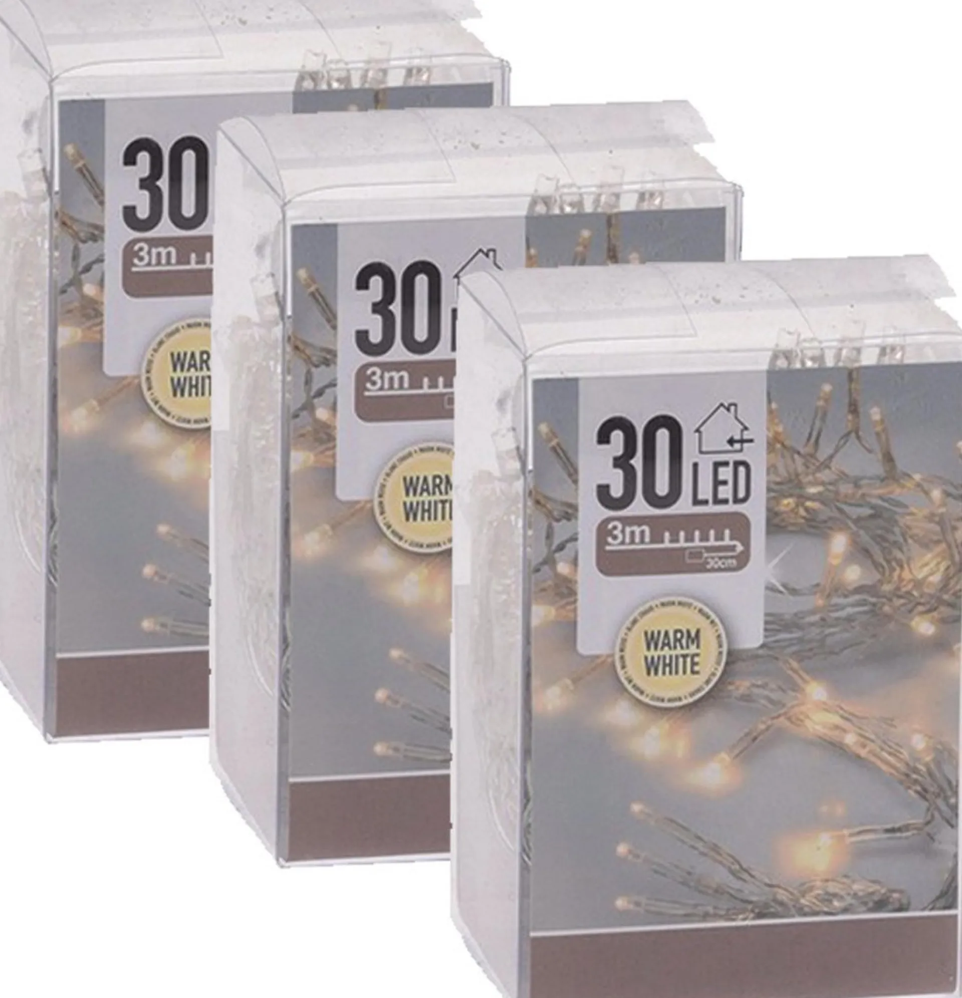 3X Kerstverlichting Op Batterij Warm Wit 30 Lampjes. Set Van 3 Lichtsnoeren Welke Per Stuk 30 Led-Lampjes Met Warm Wit Licht Bevatten. Beide Snoeren Hebben Een Lengte Van Ongeveer 320 Cm. Werkt Op 3 Aa-Batterijen, Niet Inbegrepen. U Ontvangt 3 Verpakkingen Met Per Verpakking 1 Lichtsnoer Dus In Totaal Ontvangt U 3 Kerstverlichting Lichtsnoeren.