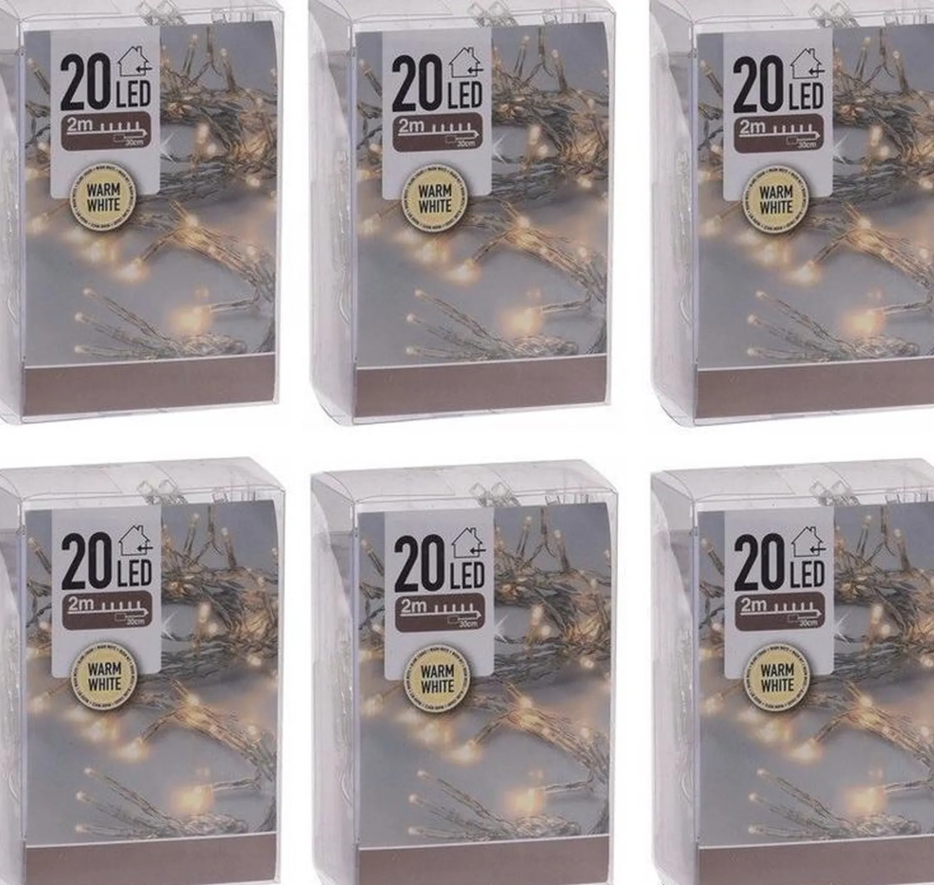 6X Kerstverlichting Op Batterij Warm Wit 20 Lampjes. Kerst Led Lichtsnoer Van Ieder 2 Meter Lang Met 20 Lampjes En Een 30 Cm Lang Aanloopsnoer. Het Snoer Is In Totaal 230 Cm Lang. Er Zit Ca. 10 Cm Ruimte Tussen Ieder Lampje. Exclusief 3X Aa Batterijen (3 V). De Verlichting Is Geschikt Voor Gebruik Binnenshuis. U Ontvangt 6 Lichtsnoeren.